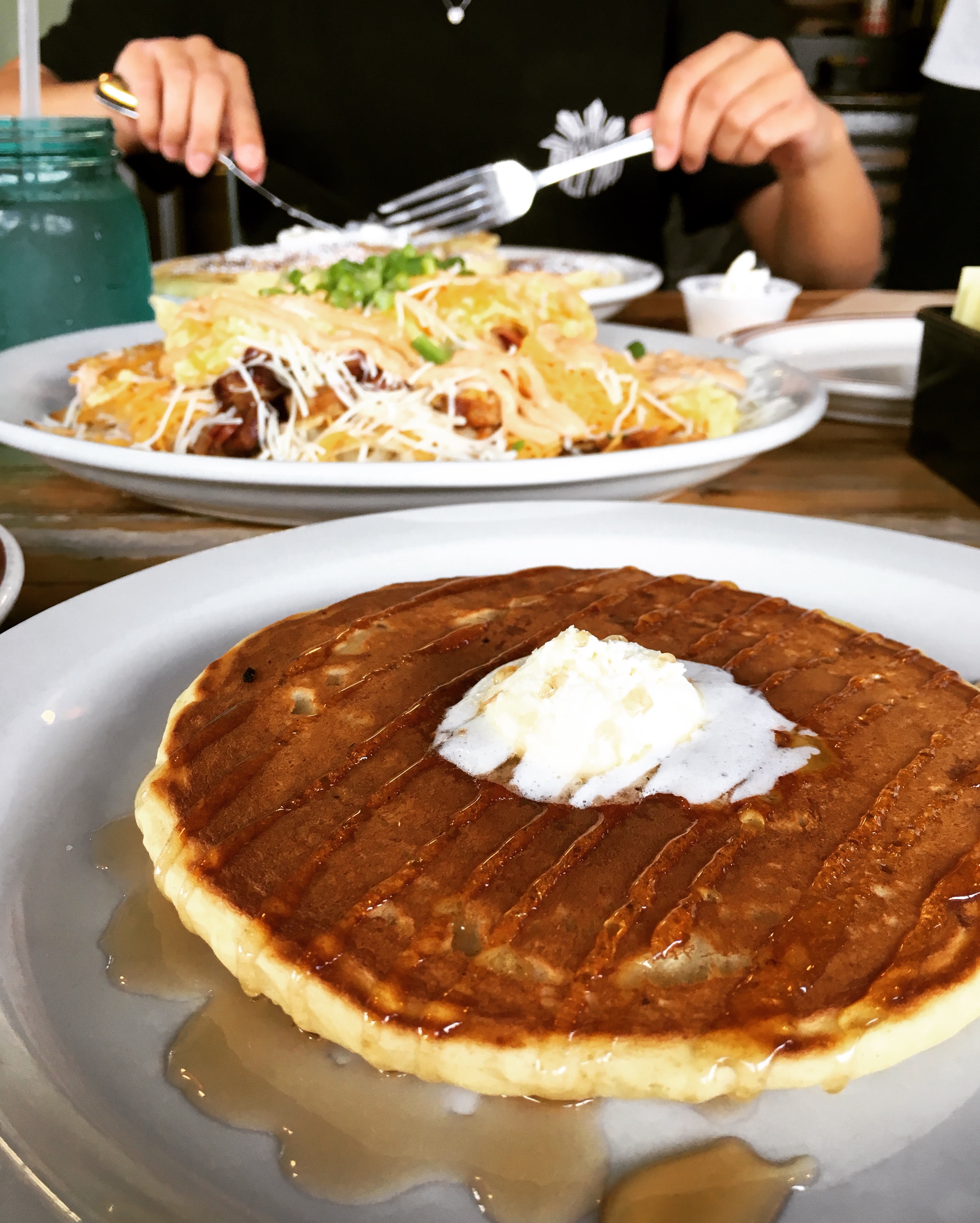 팬케이크와 토핑 가득 올라간 해쉬브라운이에요.