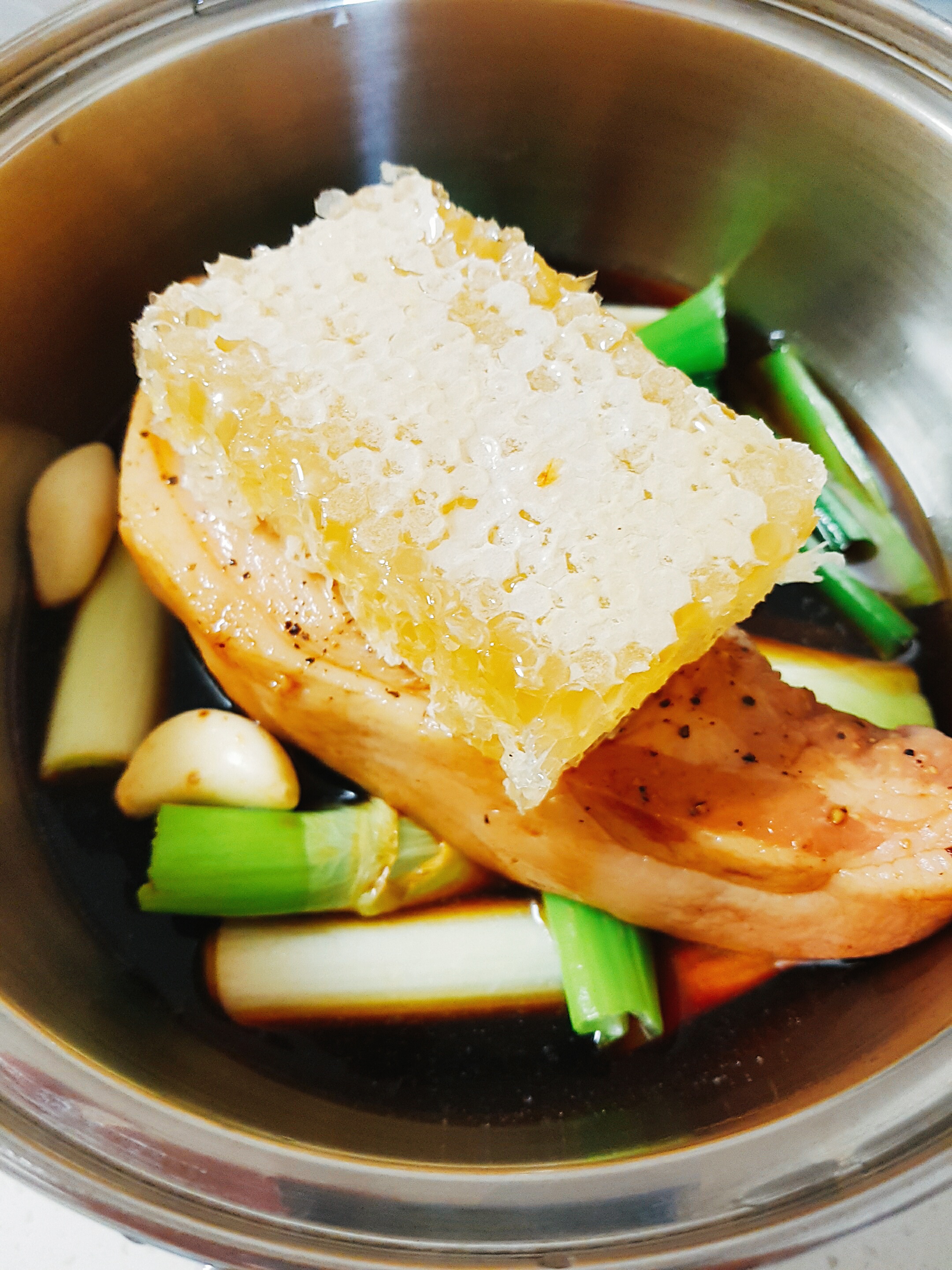 냄비에 대파, 마늘을 넣고 카츠오부시, 다시마, 멸치를 넣어 우린 육수와 간장을 넣고  그 위에 익힌 돼지고기를 놓고 벌집을 얹어서 2시간정도 푹 익힙니다.