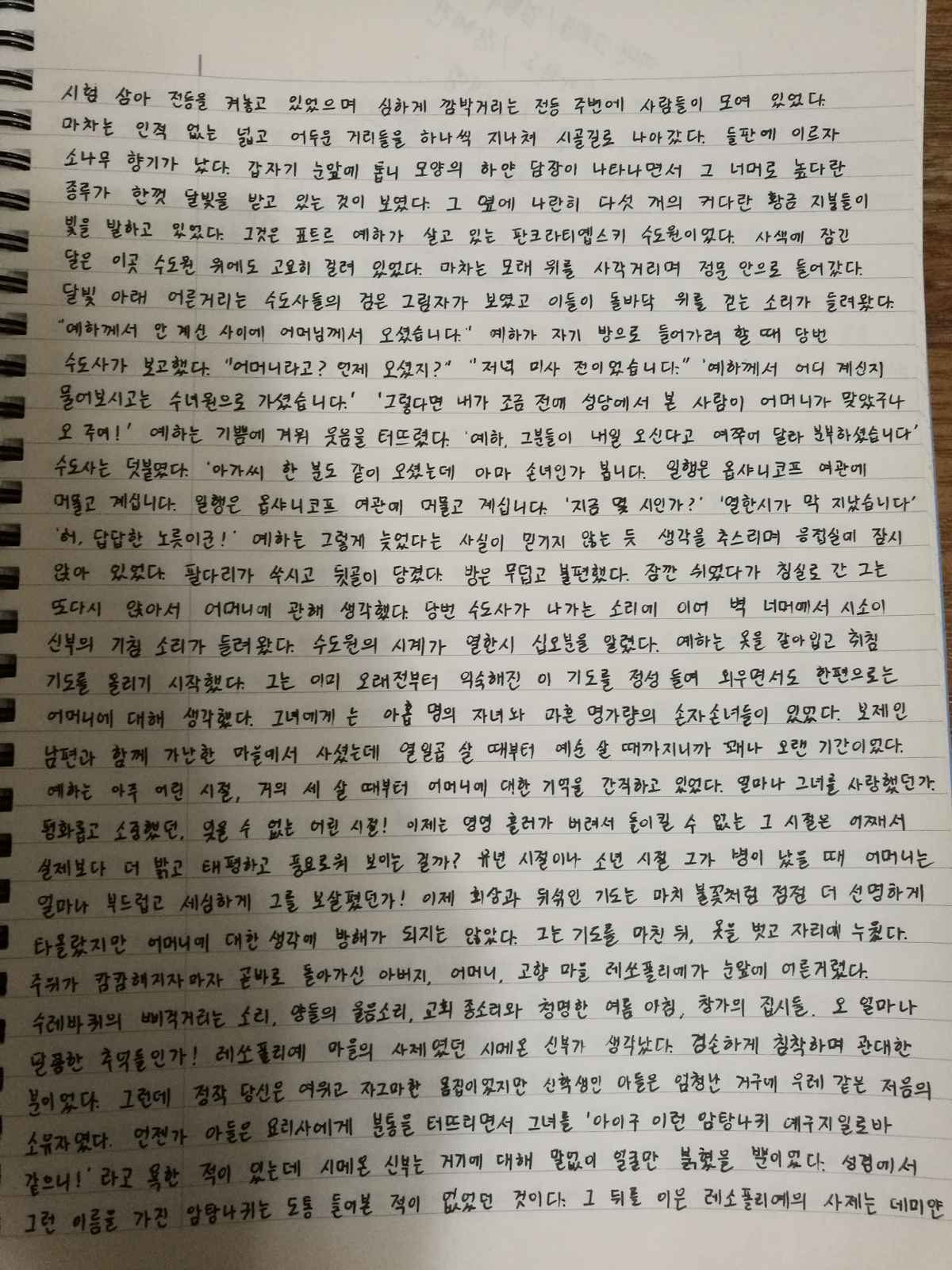아무튼... 사진은 예전에 한창 필사 열심히 할때의 흔적인데.. 체호프 같아요. 외국소설은 필사 하나마나라는 얘기도 있는데 그냥 제가 좋아서 배꼈어요. 원래 제 필체가 아니고 신경써서 한글자 한글자 또박또박 적었습니다. (원래 제 필체는 맨 아래사진.. ㅋ ) 하루에 한페이지 적는데 한시간 정도 걸렸던거 같아요.