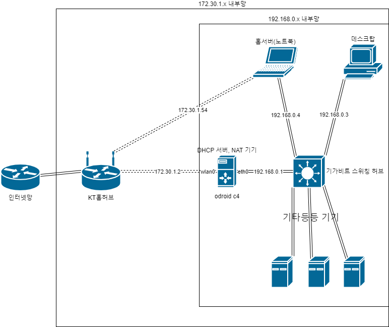 일단 네트워크 구조는 첨부파일과 같습니다. 점선은 와이파이, 그냥 선은 유선입니다. kt 유무선 공유기 내부에 내부망을 하나 더 만들려고 하는데 이유는 kt 공유기와 다른 기기들간의 물리적 거리가 멀어서 이더넷 연결이 불가능하다보니 와이파이 통신을 사용해야하는데 기기마다 와이파이 안정성이 다르고 CSMA/CA방식 때문에 각각의 기기들이 공유기랑 통신을 하면 병목도 많을것 같아서 공유기와 통신하는 기기를 하나로 만들려고 하는데요. 일단 odroid c4라는 기기를 dhcp 서버로 만들고 nat 설정을 해서 내부망이 외부 인터넷과 통신이 가능하게는 만들었습니다. odroid c4, 노트북은 우분투입니다. 여기서 문제가 두가지 있습니다. 1. dhcp 서버에서 홈서버(192.168.0.4)로 1번에서 50000번까지 포트포워딩을 하려는데 이게 검색해서 여러가지 시도해봐도 잘 안됩니다. dhcp 서버에서 /etc/rc.local에 iptables --table nat -A POSTROUTING -o wlan0 -j MASQUERADE iptables -A FORWARD -i eth0 -j ACCEPT 이 두줄을 추가해서 nat 설정을 한것 같기는 한데 이것 때문인지 다른 시도들이 다 안되는것 같습니다. nat은 유지하고 포트포워딩을 하려면 어떻게 해야하나요? 2. 현재 1번의 문제로 홈서버 역할을 하는 노트북은 무선(172.30.1.54)으로 kt 공유기와 연결된 상태로 kt 공유기에서 포트포워딩을 받고있습니다. 그런데 이 상태에서 노트북에 이더넷 선을 꽂아 내부망과 연결시키면 일부 서버가 접속이 불가능해집니다. 노트북의 nginx 서버는 이름 기반 가상호스팅을 하고있는데 일단 이름 기반 호스팅은 전부 마비가 됩니다. 서버중 하나가 워드프레스 젯팩 서비스를 쓰는지라 마비되면 바로 알림이 옵니다. 이외에도 ip로 직접 접속하는 경우에도 몇몇 서버는 작동을 안하는것 같습니다. nginx 설정을 살펴봤지만 listen 하는 포트만 있을뿐 주소는 없는지라 특정 주소만 받는것도 아닙니다. 그와는 별개로 노트북의 인터넷 연결은 잘만 됩니다. 그리고 2번의 모든 문제는 이더넷 선을 다시 뽑으면 바로 해결됩니다. 뭐가 원인인지 추측되는게 있을까요? 0