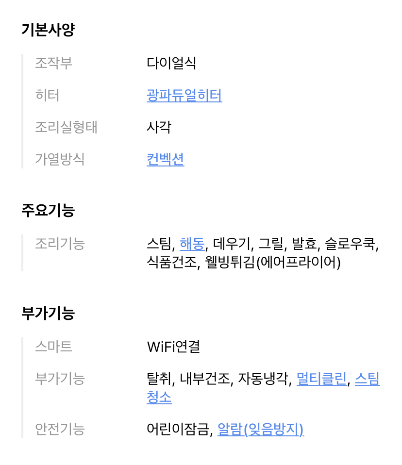 스마트폰이나 랩탑 같은 건 스펙시트 보면 가격이 바로 연결되는데 오븐은 전혀 몰라서 왜 가격 차이가 나는지도 이해가 안 됩니다. ㅠ