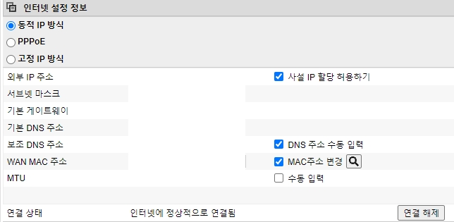 iptime에 문의했더니 원격으로 사진처럼 인터넷 설정정보에