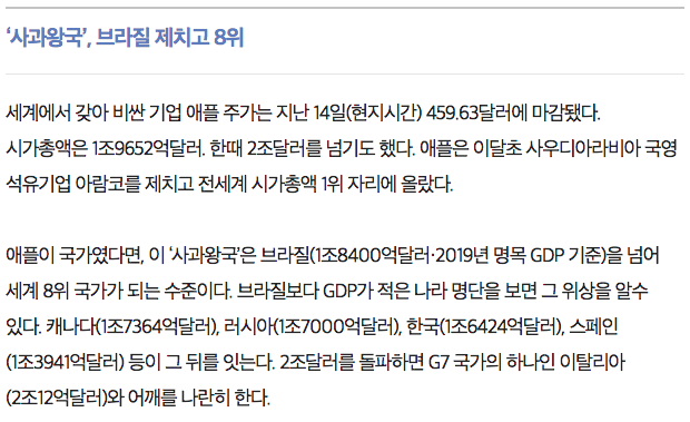 2020년 08월 기준(뉴스 기사)으로도 애플은 국가와 비교했을 때 브라질을 넘어서는 세계 8위 수준의 가치를 갖고 있었는데요. 이 정도라면 특정 지역 혹은 국가를 매입해서, 새로운 형태의 무언가가 가능할 것 같은데요. 그리고 해당 지역 혹은 국가의 기존 거주자들도 몹시 환영하지 않을까 싶습니다. 기사에서는 농담처럼 사과왕국이라고 불렀지만, 정말 사과왕국이 실존한다면 누구나 가고 싶어하는 곳이 될 것 같습니다. 예를 들어 애플이 마다가스카르를 매입해서 사과 왕국으로 바꾸고, 수도 이름을 스티브 잡스로 정하는 것만으로도 과거 아메리칸 드림을 넘어서는 이민 행렬이 생겨나지 않을까요? 그리고 역사 상 이러한 사례 혹은 유사한 사례가 있지 않을지 궁금합니다. 0
