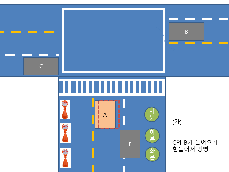 (가) 와 같이 신호대기 하고 있으면, C와 B가 들어오지 못하거나 힘들어서 빵빵