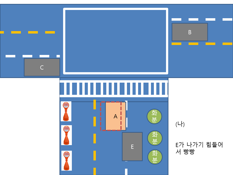 (나) 와 같이 신호대기 하고 있으면, E가 나가지 못하거나 힘들어서 빵방