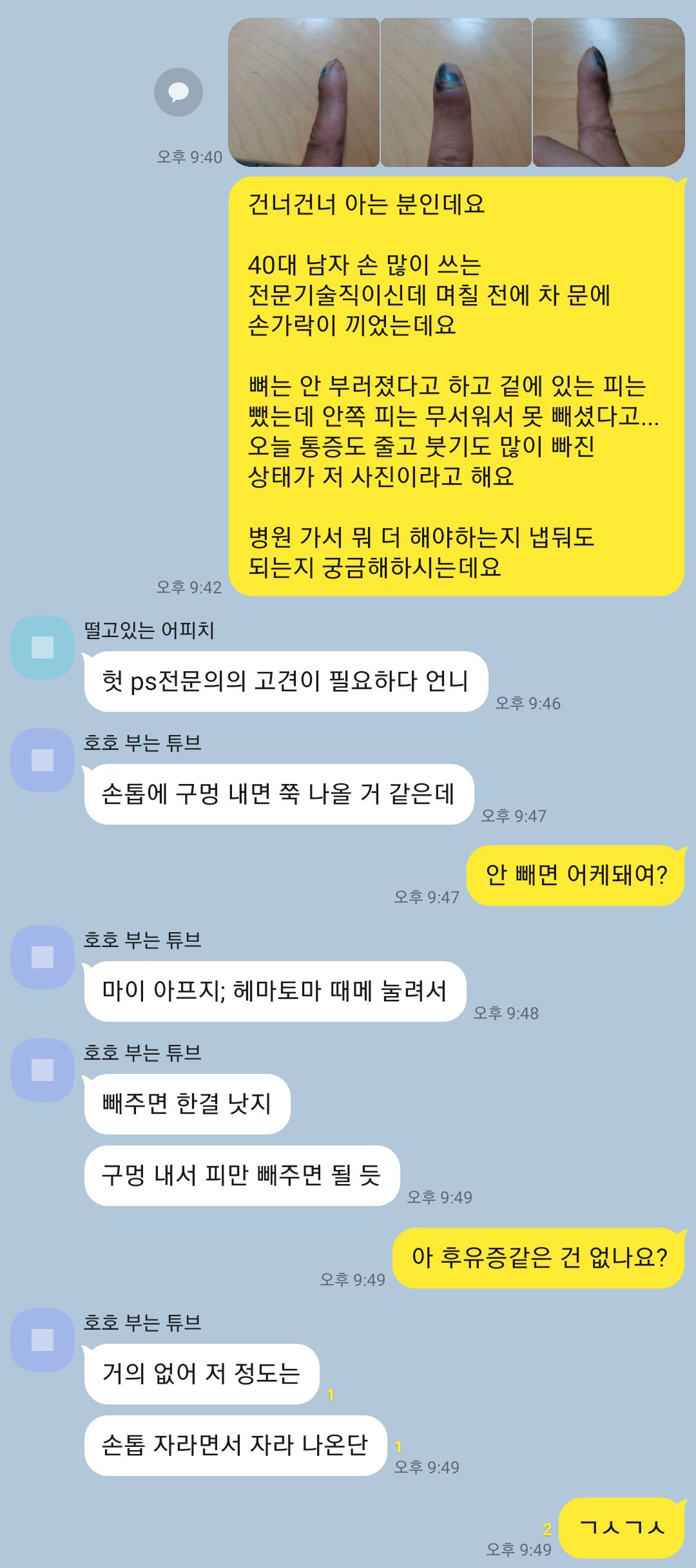 안녕하세요. 손가락이 자동차문에 끼어서 며칠 고생 했는데요. 통증도 줄고 붓기도 많이 가라앉았습니다. 이제 손톱쪽만 붓기가 있는 상태인데 이 상태에서 병원가서 피를 뺀다거나 하는 조치를 추가적으로 해야할지 궁금합니답 내일 시간이 좀 있어어 병원 가려면 내일 가야합니다. 사진 첨부할게요. 의료넷의 명성답게 고명하신 의느님들의 많은 답변 부탁드립니다 0