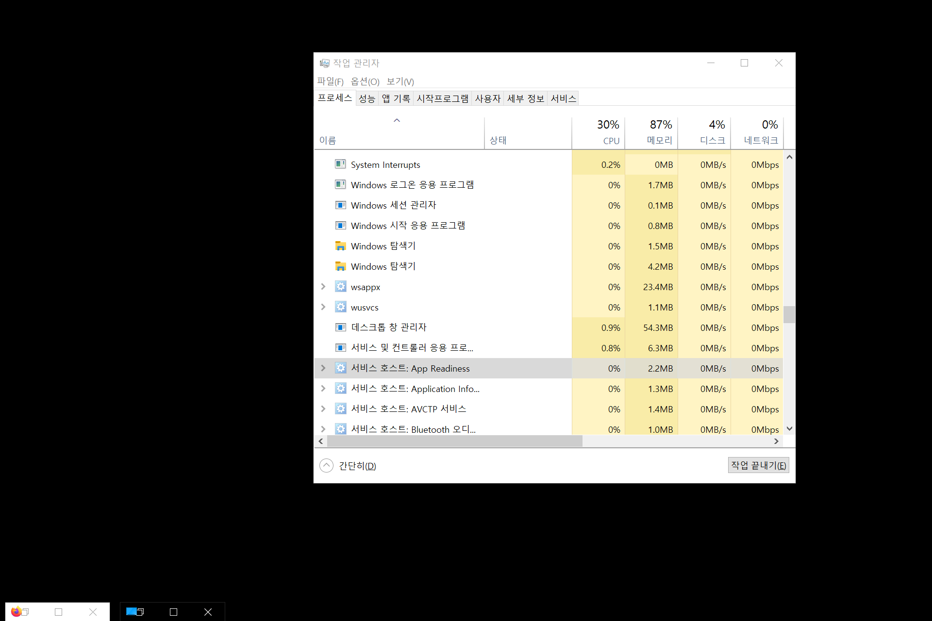 바탕화면이 검게 나타나고 시작표시줄이 안뜨니까 작업관리자 열어서 여차저차 쓰고 있긴한데