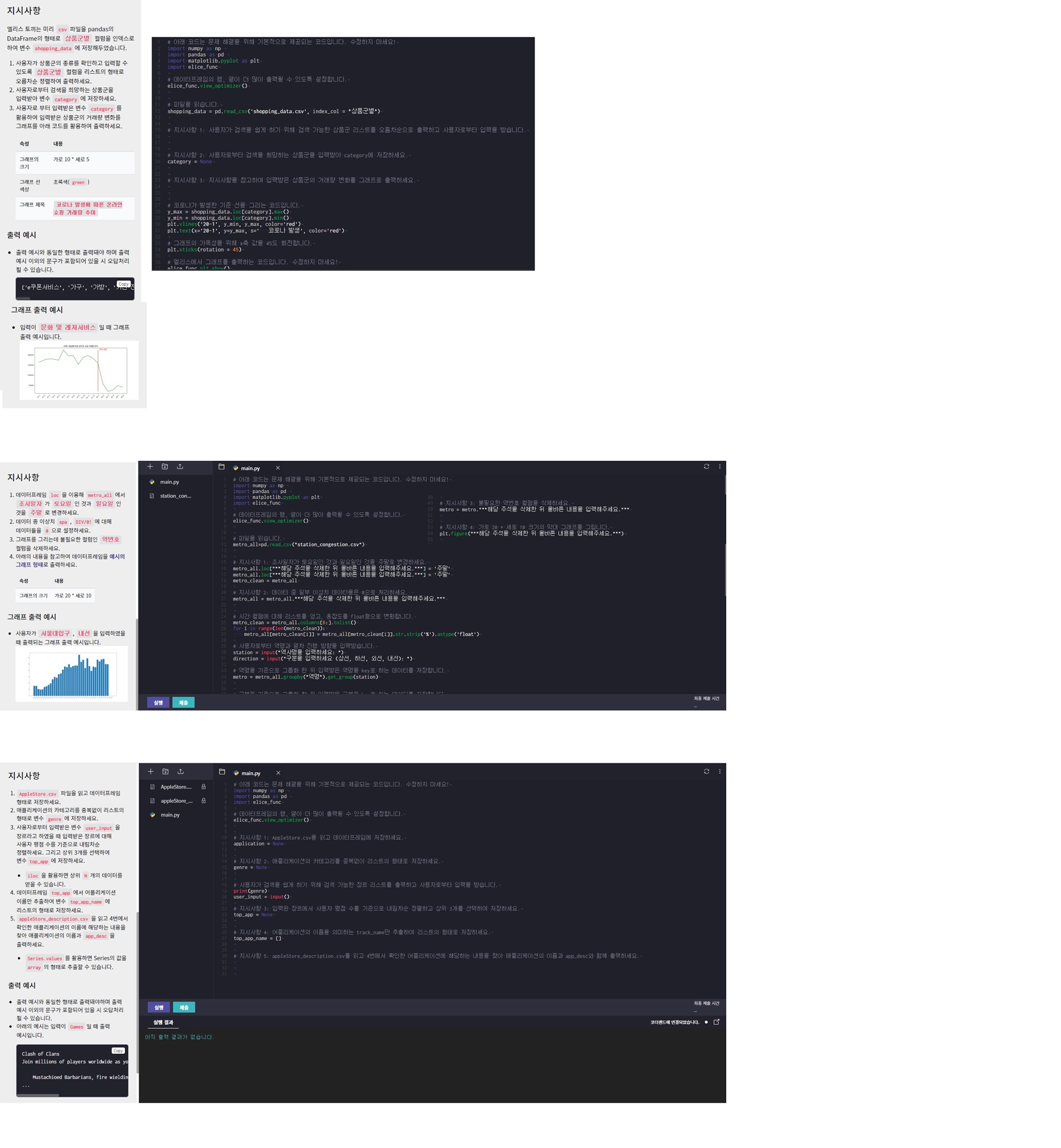 문제는 총 3개이고.. 지시 사항들에 대한 코드를 작성해야 하는 부분입니다 ㅠㅠ