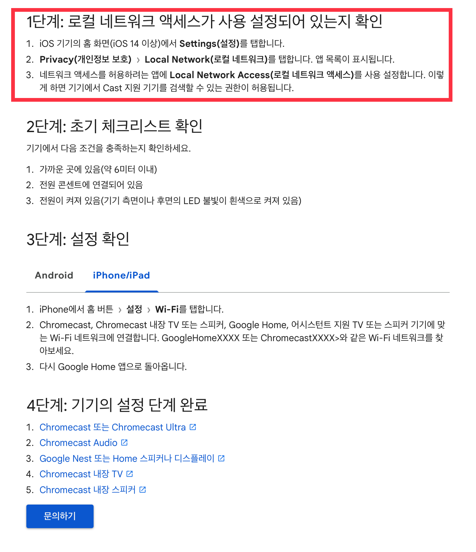 오늘 크롬캐스트 3이 도착을 해서 연결을 하려는데 연결이 안되네요. 휴대폰 기종은 아이폰11이고, tv는 2014년에 산 lg uhd 티비입니다. 인터넷은 kt이구요. 구글홈을 깔아서 시키는데로 진행을 하고 마지막에 확인을 하면 그림과 같은 메시지가 뜨면서 연결이 안됩니다. kt 모뎀도 껐다 켜보고 크롬캐스트 재부팅도 해보고 했는데도 안되네요. 뭐가 문제일까요… 0