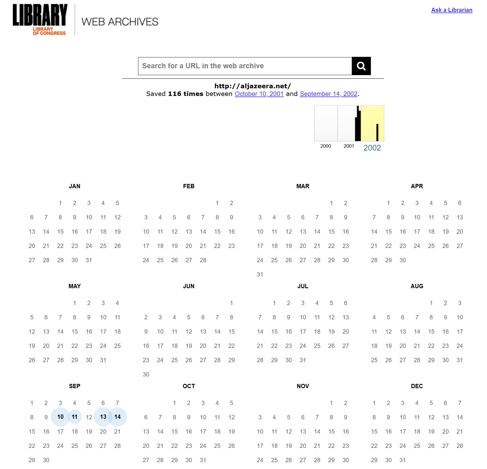 를 접근할 수 있는 방법이 있을까요? https://webarchive.loc.gov/legacy/20010201000000*/http://aljazeera.net/ 를 찾기는 했는데, 9월 자료는 없고 10월부터 있더라고요. 0