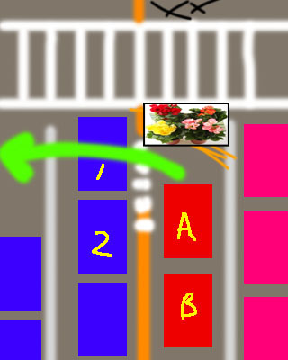 1. 미친듯이 경적을 울려 건너 차선 마지막 차량을(1번 차량) 후진 시켜 횡단보도에 걸치게 한다(교통 법규 위반?)