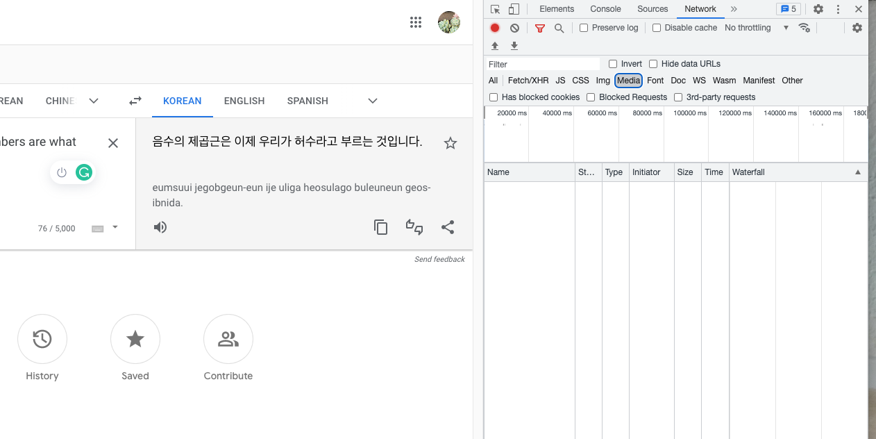 구글 번역기의 소리를 mp3로 다운받기 위해서는 inspect를 누르고 network로 가서 media를 클릭한 다음, 번역소리를 플레이하면 파일이 생성돼서 그걸 새로 오픈, 다운로드하면 되는데요. 저 같은 경우는 media에서 파일이 생성이 안 돼요. 이미지에서 보시는 것처럼 all을 확인해 보면 다른 파일은 떴는데 media파일만 안 떠 있어요. 이럴 땐 어떻게 해야 하나요. 미리 감사드립니다 (_ _) 0