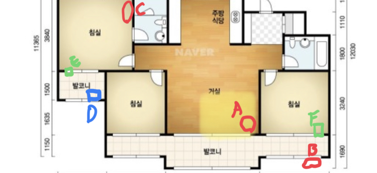 일단 저희 집 구조는 사진과 같습니다. 집에 들어올 때부터 B 위치에는 실외기함이 있었고, 관리사무소로부터는 실외기함 빼고는 다른 실외기와 배관을 건물 밖으로 빼서는 안된다는 경고를 하더라구요. 그럼에도 각 집들이 배관을 밖으로 뺀 경우가 많길래, 아니 왜들 저렇게 보기 안좋게 밖으로 배관을 빼지 했는데… 막상 설치하려고 보니, 왜 그렇게들 했는지 바로 이해했습니다… 2in1에어컨으로, 일단 A와 C위치에 설치하려고 했는데, 이럴 경우 C위치에서 실내 배관으로 B의 실외기 함에 연결이 불가능하다더군요. 이에 해결책을 고민해 봤는데, 각 안이 도출된 시간대로 나열하면 아래와 같습니다. 1안 : 스탠드형 에어컨(A 위치 배치), 창문형 에어컨 (E 위치 배치) - 제일 간단한 해결책이긴 합니다만, 창문형 에어컨이 시끄러울거라는 문제, 그리고 창문형 에어컨이 위치한 발코니 활용에 문제가 있을 수 있다는 점이 걸립니다. - 일단 이렇게 했다가, 나중에 벽결이 에어컨을 설치할 수 있는 방법이 도출된다면 창문형 에어컨은 E로 보낼 예정에 있습니다. 2안 : 2in1 에어컨 구매(A 위치에 스탠드, C위치에 벽걸이), 천장 뜯어서 B까지 배관 - C위치의 천장을 뜯고, 배관을 위로 보내서 B까지 연결하는 약간의 공사가 들어가게 됩니다. - 다만 벽걸이 에어컨의 배관이 지나치게 길어져서, 냉방 효율이 떨어질 수 있고 천장 뜯어서 공사하는데 200만원의 추가 비용이 들어갑니다. 3안 : 스탠드형 에어컨(A 위치 배치), 벽걸이 에어컨(C 위치 배치) - 별개로 구매해서 실외기를 A, D에 각각 두고 배관하는 방식입니다. 에어컨 틀때만 베란다 문을 여는 형식으로… - 실현 가능성이 있는지를 잘 모르겠고, 일단 베란다 안쪽에 에어컨 실외기를 두었을 때 소음과 열기 문제가 있지 않을까 걱정되네요. 이런 형태의 집에 에어컨을 설치해보셨던 분이 있으시다면, 조언을 부탁드립니다 ㅠㅠ 0