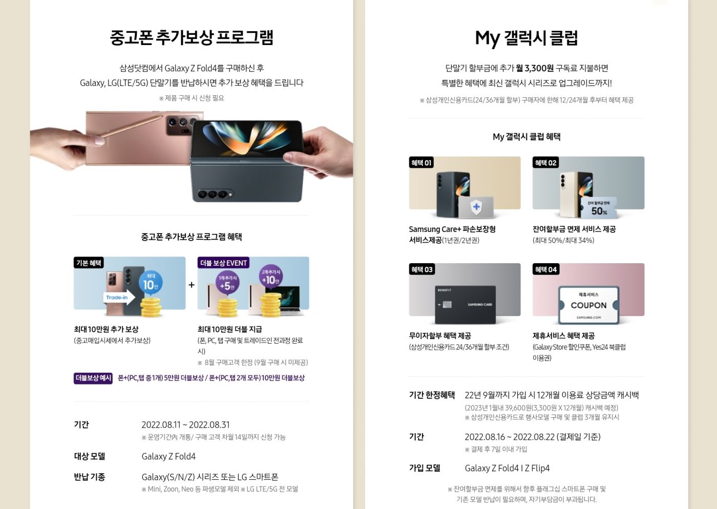 2년전에 자급제로 샀던 갤 폴드2 정말 잘 쓰고있읍니다. 폴드3에서 펜나왔을때 살까 하다가, 존버하면 갤노트처럼 (이전폰은 노트8이었는데 역시 잘 썻읍니다. 펜 덕분에 고전게임,윈도우겜 잘했네요) 일체형 s펜이 폴드4에 나올꺼 같아서 기다렸는데, 안나와서 그냥 사려고 합니다. 질문이 몇가지 있읍니다. 제가 몇년째 자급제만 사는데, 예전 휴대폰들은 당근에 팔기 귀찮아서 누구 선물로 주거나, 창고에 썩히는 편입니다. 이번에 광고 떳길레 사려는데, 중고보상프로그램을 한번도 써본적이 없어서 이거 쓸만한건지 여쭙습니다. (너무 창렬이면 나중에 호갱당한 경험에 기부니가 나빠져서? 차라리.창고행이나을듯해서) 그리고 2년전 자급제 사전예약 할때는 부산 어디 홈플러스안에 있는 삼성프라자에서 10%할인받고, 1년 보험(액정필름교환권잘썻네요), 갤럭시버즈?(당시에 나온건데 귀아파서 창고행)도 받아서 굉장히 혜자로 샀던거 같은데, 이런 프로그램이 있을까요? (재가 찾은 링크사진은 삼성닷컴공홈광고) 뽐뿌나 다른 커뮤를 거의 안해서.. 핫딜 이런거 하는데를 모르겠네요. (2년전 이 정보도 피쟐에서 받았던걸로 기억 ㅋㅋ 쿠팡이나 오픈마켓 사전예약은 안하려 합니다. 예전에 배송기사분한테 사기당할뻔 한적이 있어서) 0