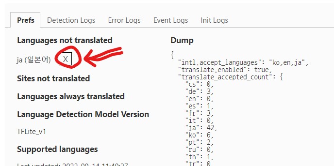 'Languages not translated' 항목에 일본어가 들어가 있어서