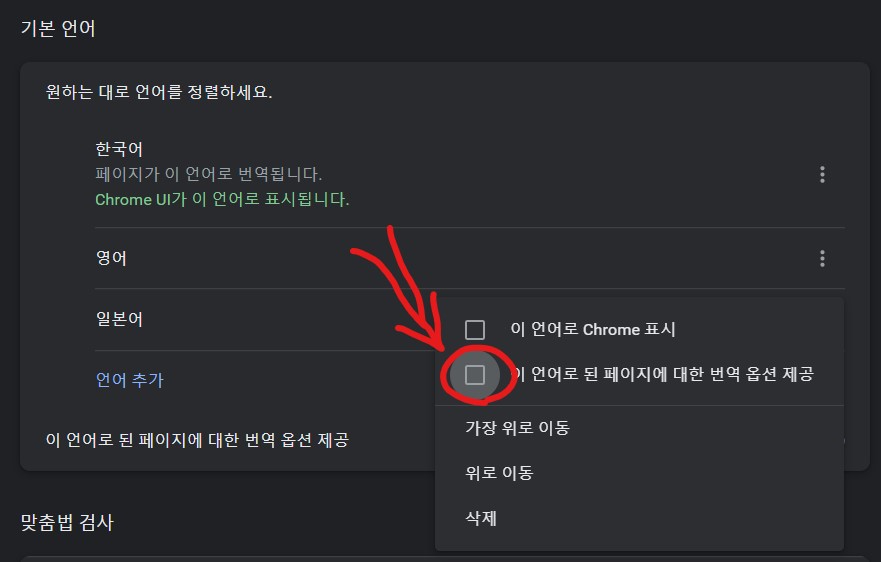 부가 메뉴에서 "이 언어로 된 페이지에 대한 번역 옵션 제공"을 선택해도 적용이 안 됩니다.