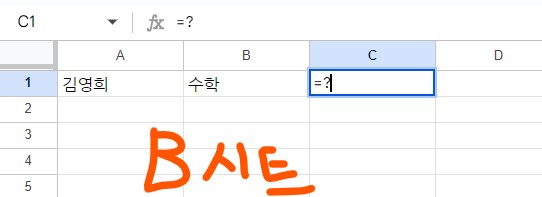 B시트에서 이름과 과목을 입력하면 A시트에서 맞는 항목을 찾아서 점수를 받아오고 싶은데요.