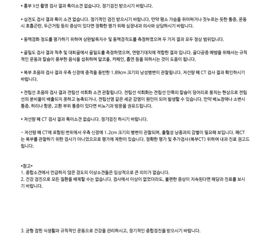 만 28세 남성입니다 최근 직장에서 건강검진 받았는데요 복부초음파, 흉부ct 소견으로 신장 물혹이 있다고 떠서 좀 당황스러웠습니다. 이것저것 알아보니 많은분들이 갖고계시고 큰 문제 없다고하여 넘길라니 또 찝찝해서.. 토욜에 초음파 검사 다시 받아보려고하는데요. 홍차넷 계신 선생님들의 간단한 의견 구하고 싶습니다. 이미지 올려드린 소견서에 특히 중격을 포함한 낭성병변이라는게 단일혹이 아니라 좀 나뉘어져있는 모양이라는건지.. 정밀 검사가 필요한건지 궁금합니다. +여태 불편함을 모르고 살아왔고, 통증같은거 느껴본적이 없어 의미 안두고싶어도 신경이 쓰이네요.. 0