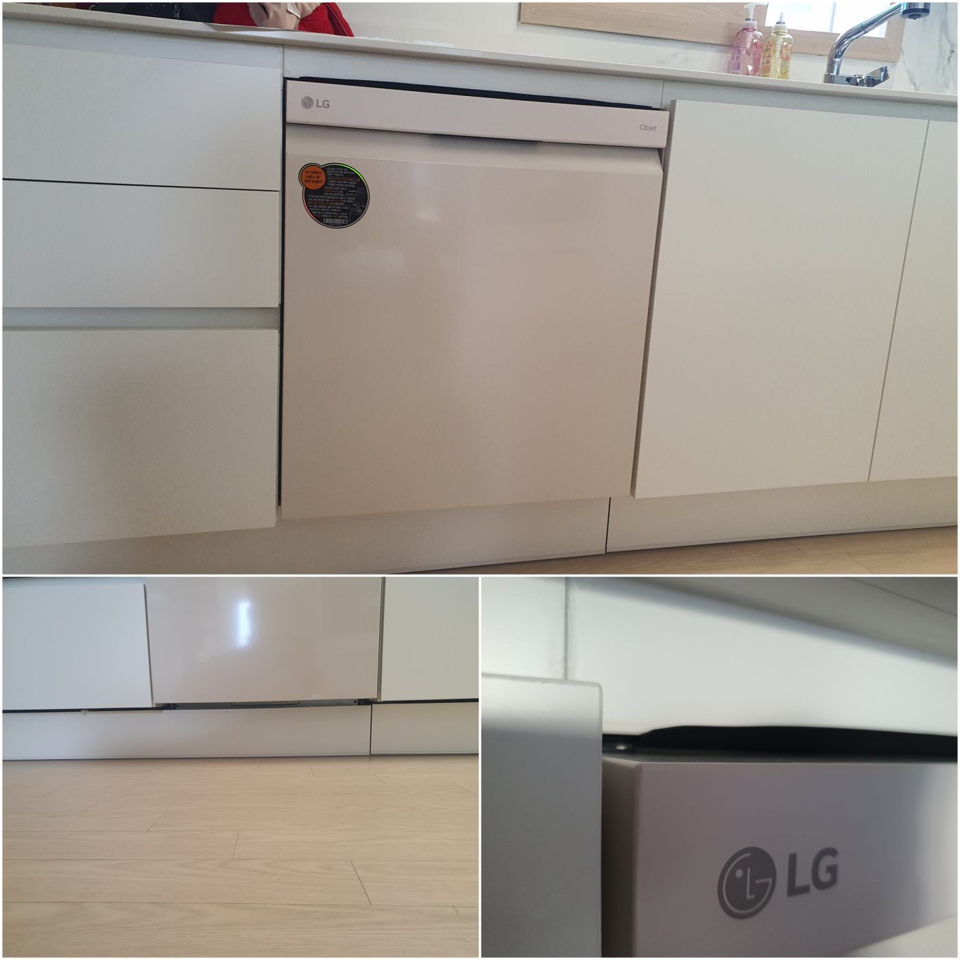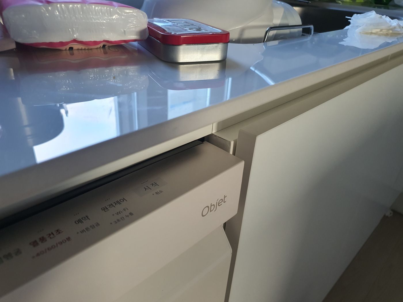 문제는 이후 LG 기사가 방문하여 설치하는데 연신 난감해하며 하부장 도어 위쪽 선, 아래쪽 선 어느쪽에도 맞출 수 없으니 저 보고 어느 쪽에 최대한 맞출 건지 선택을 요구하는 겁니다. 위쪽에 맞추면 아래 걸레받이와의 간격이 커지고, 아래쪽에 맞추면 하부장 상부와 식기세척기 사이에 손도 들어갈법한 간격이 생겨 그 안이 들여다 보이는 말도 안되는 일이 벌어져, 그나마 허리를 숙이지 않는 한 눈에 띄는 틈새가 보이지 않는 전자로 해달라 했습니다.