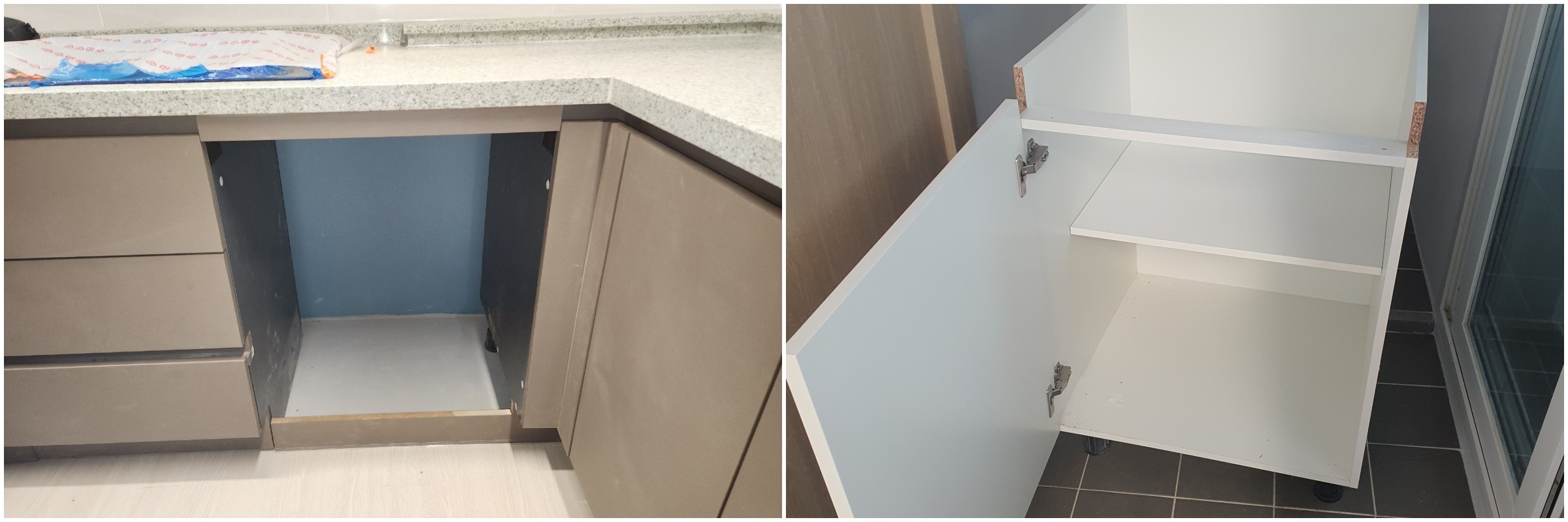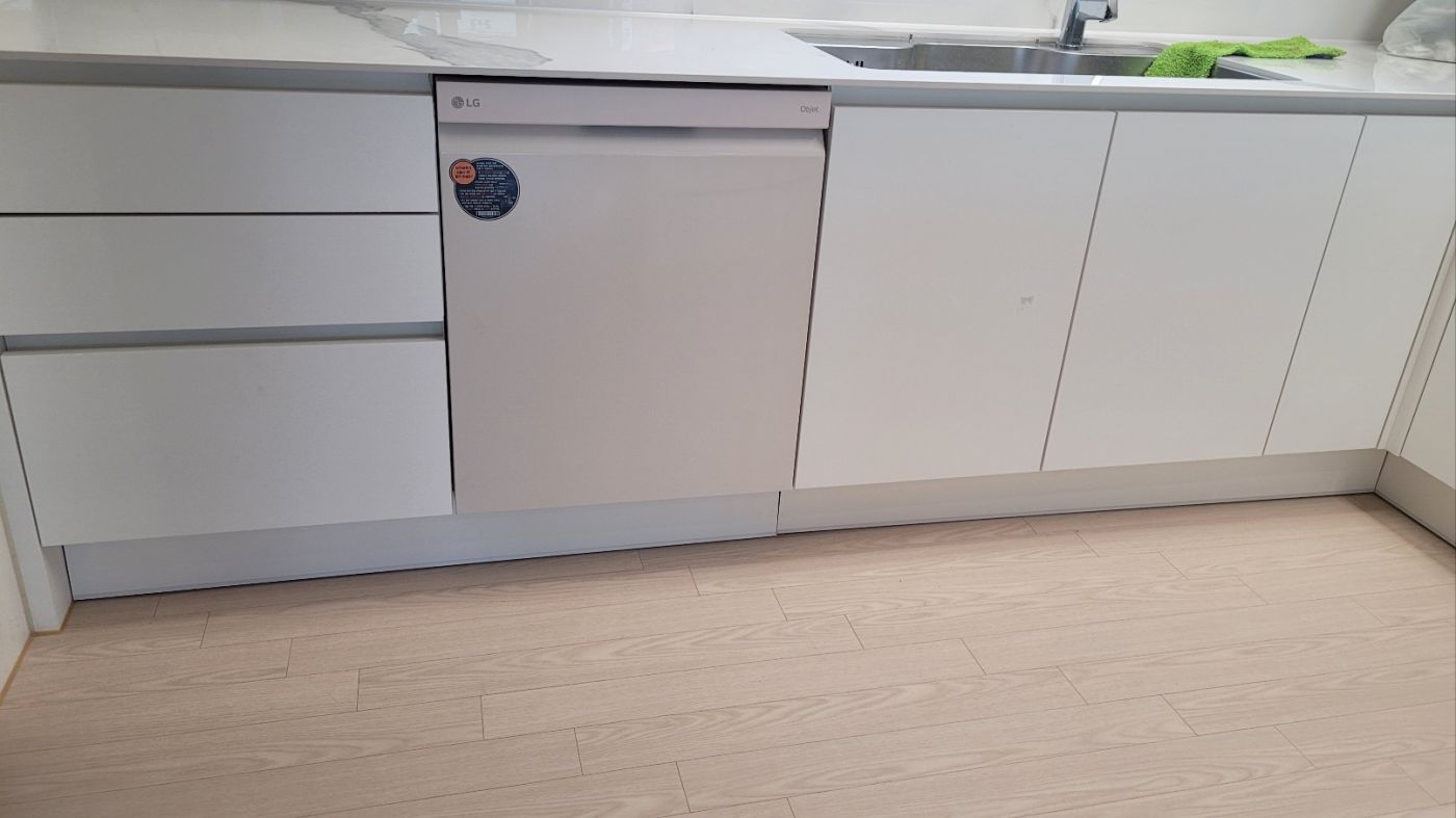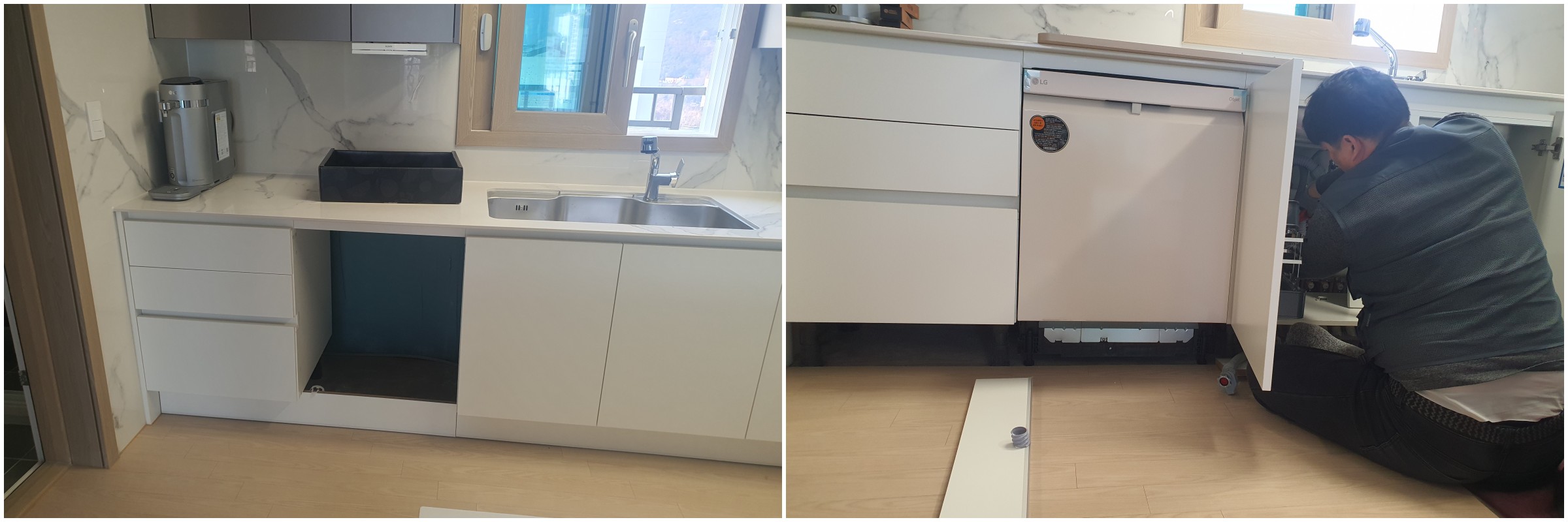 이번에 신축 아파트로 이사하면서 가전을 LG로 전부 맞췄습니다. 구매처인 백화점 입점 매장으로부터 소개받은 닥터매직이란 업체에게 냉장고장 시공과 전기레인지 설치를 위한 세라믹상판 타공을 맡겼는데, 업체가 방문해 사전실측을 하며 식기세척기 자리 또한 마련해주겠다 하여 그렇게 했습니다. 식기세척기를 싱크대쪽에 두기 위해 맨 왼쪽에 있던 하부장을 빼내고 칸이 여러개라 유용해 남길 가치가 있는 서랍형 하부장을 그곳으로 옮기더군요. 걸레받이와 다른 곳은 일절 손상시키지 않고 빼내기와 옮기기만 한 걸로 기억합니다.