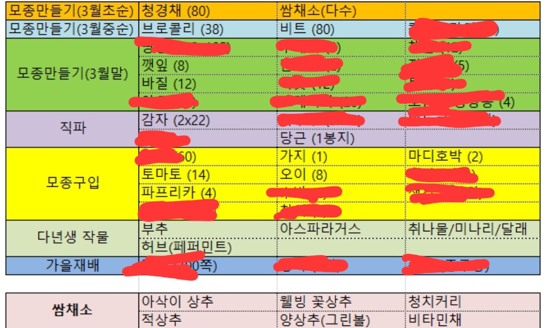 현재 집앞 정원은 잔디로 가득차있는데요. 땅 뒤집고 야자매트 깔아서 길을 내고 남는 땅에는 소소하게 집에서 먹을 야채들을 길러볼 생각입니다. 처음 해보는 일이라 티비에서 본 것 처럼 비닐작업을 해야하는지, 그리고 적정 작물의 종류수와 갯수, 작물간의 거리 등 도무지 알고 있는 바가 없읍니다. 벌레를 끔찍히 싫어하시는 와님때매 살충제를 죽어라 뿌릴 것 같은데, 그냥 맨땅에 헤딩도 좋지만 푸로농사마스터님들의 어여쁜 관심 부탁드립니다. 인터넷 돌다가 이정도면 좋다 싶은 작물들중에 제가 먹을 가능성이 있는 애들을 조금 추려봤읍니다. 추천 미리 감사드리읍니다.