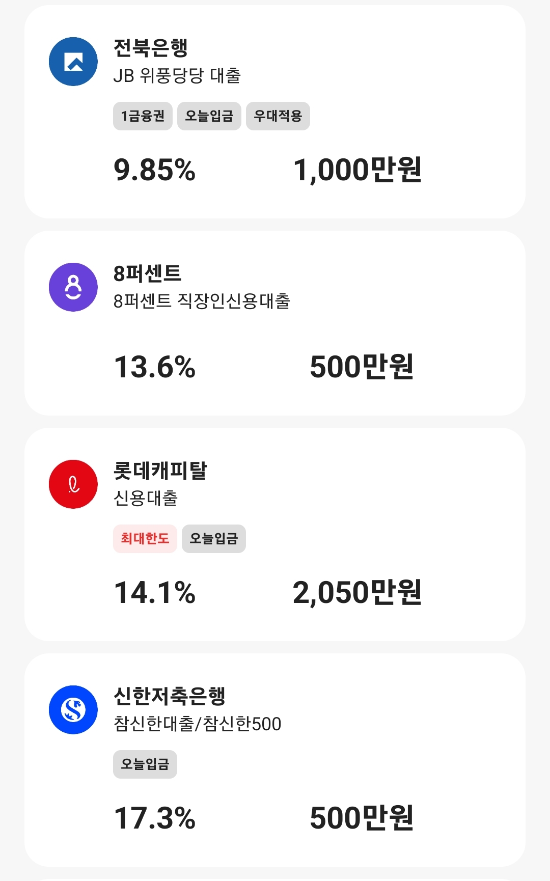 안녕하세요 홍차넷회원분들께 여쭤보고 싶은게 있어서 글을 올립니다. 제가 토스/카카오에서 대출 조회 하니까 저렇게 목록 나오던데.. 저게 다 대출이 되는게 아니라, 어느 하나만 대출하면 나머지는 다 막히는 대출인가요? 조금 단기간에 자금이 필요한데, 마이너스 통장만 해왔지, 대출은 처음이라서 조금은 막막하네요. 하나카드 국민카드 카드론도 옵션에 있긴한데, 이건 가장 마지막으로 고려해보려고 합니다. 단기간에 삼사천정도 융자가 필요해서 그런데, 일단은 제 1금융권인 전북은행에 대출을 받고, 나머지는 햇살론으로 가능한지... 알고 싶네요. 아시는 분 있으면 조언해주시면 감사하겠습니다. 참고로 도박이나 토토 그런 건 아닙니다 ㅎㅎ 0