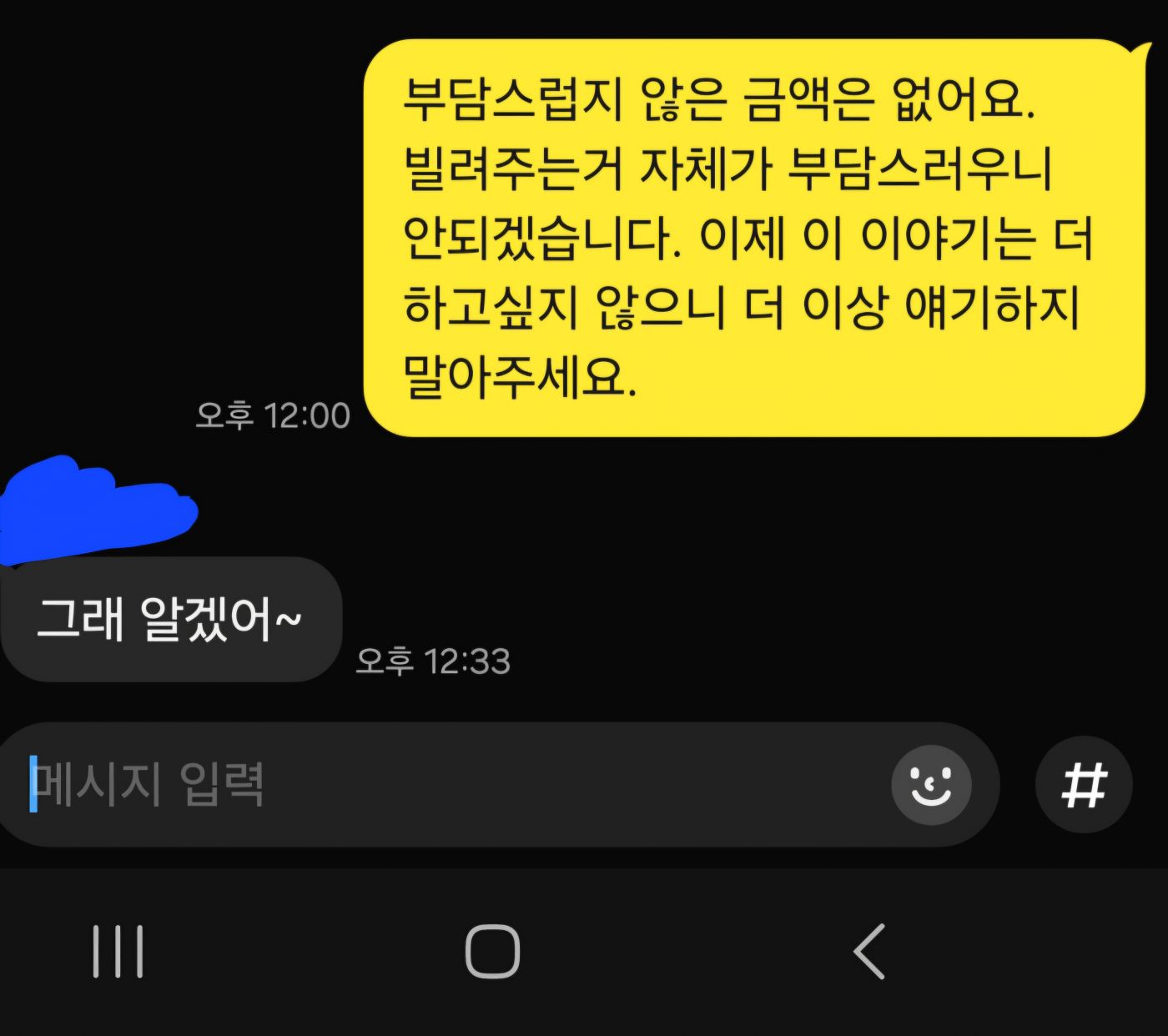두번째 짤은 직접적이지는 않지만 돌려서 거절하려고 조금이나마 노력을 해봤습니다.