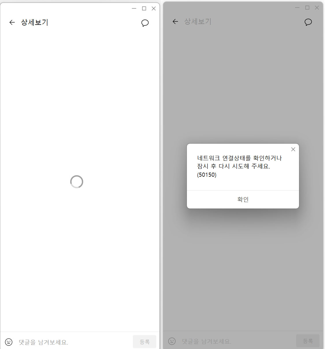 톡게시판을 누르면 스크린샷처럼 무한로딩 상태에 빠지다가 네트워크 오류 메시지가 뜨기 일쑤입니다.