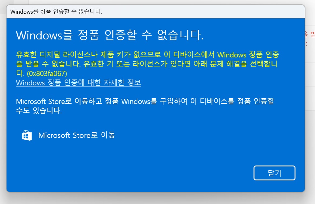 오늘 오전 컴퓨터 업데이트 이후 윈도우 정품 인증하라고 글자가 화면에 떠서 정품인증 들어가서 제품키 변경에 들어가서 제품키를 누르니 아래와 같이 나오면서 정품인증이 되지가 않습니다.