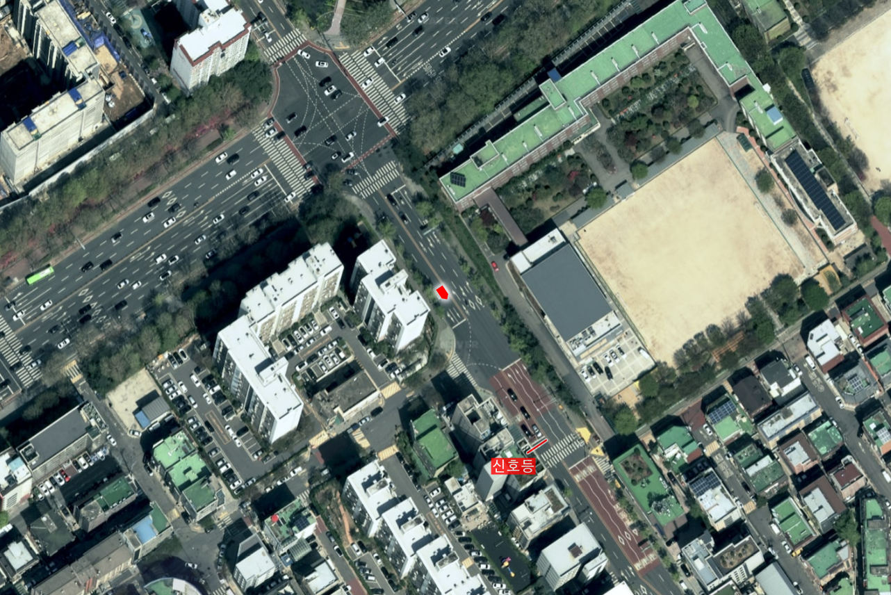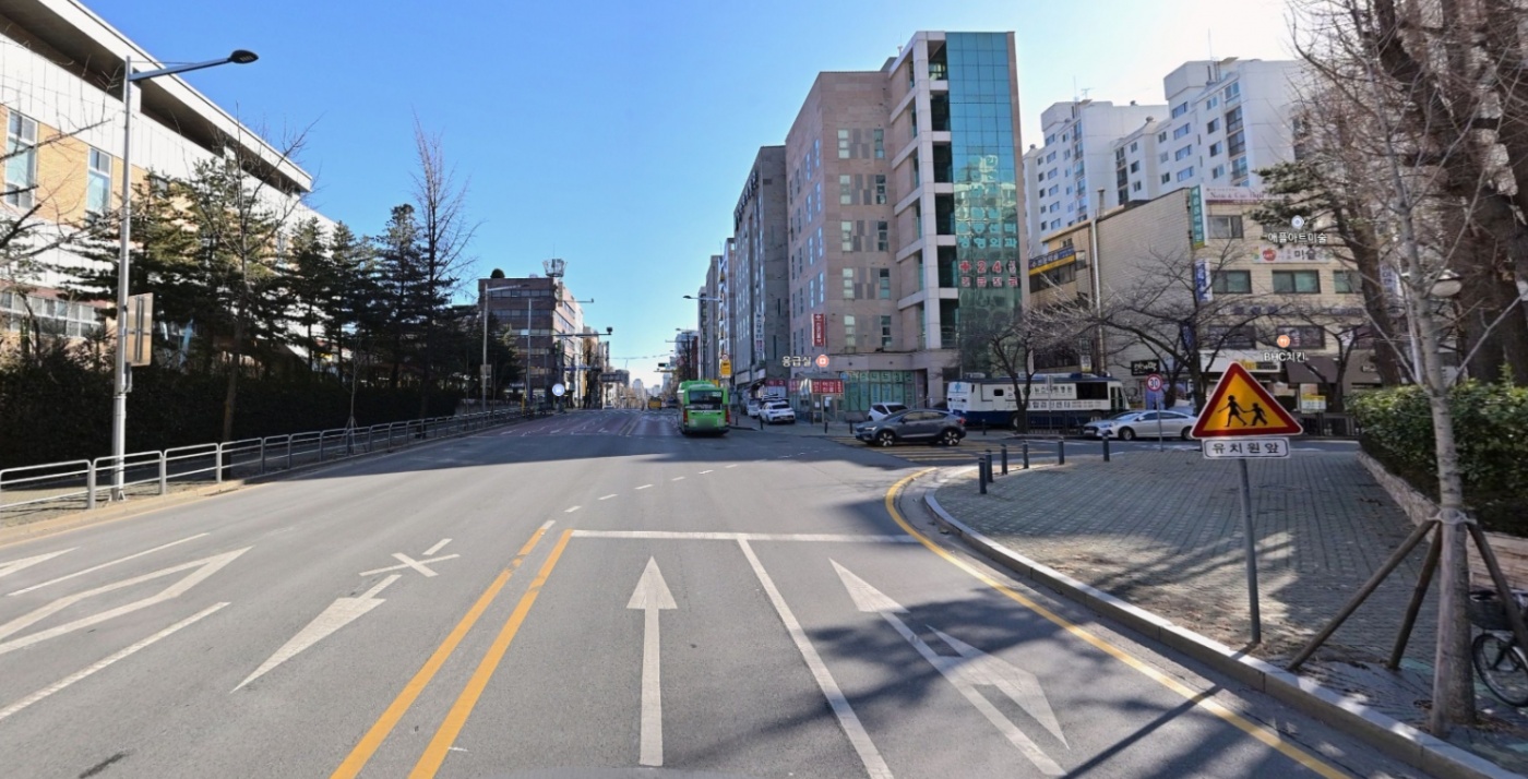 위 사진 가운데처럼 진행하는 차량은 아래쪽 신호등이 빨간불일 때 바로 앞 삼거리 정지선에서 멈춰야 하는지 궁금합니다. 신호등과 상당히 거리가 멀어서 미처 인지하지 못 했는데, 삼거리에 별다른 신호등이 없고 선까지 그어져 있으면 저 신호등이 여기까지 적용된다고 봐야 하는 건지 아리송하네요. 해당 지점에서의 시야는 아래 사진과 같습니다.