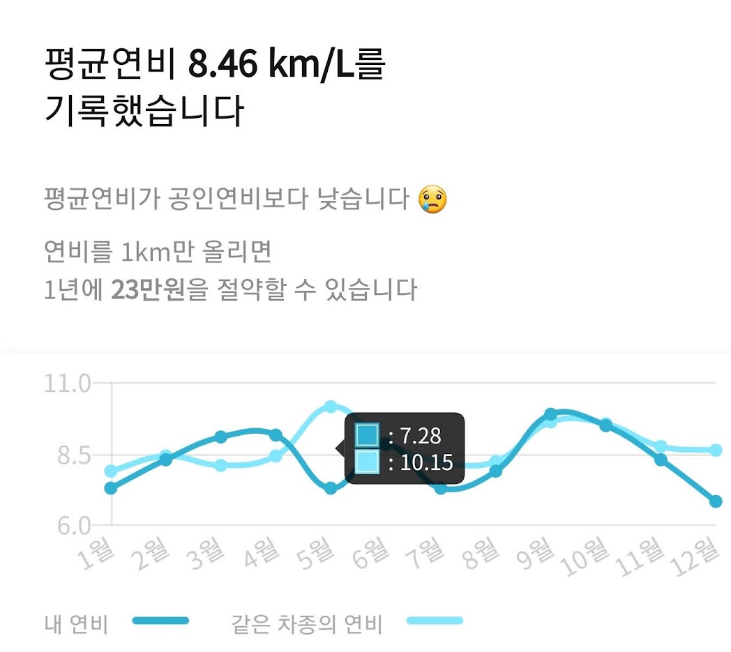 차종은 소형suv베뉴 이고 3 6월까지는 보통 다니던 길로 갔을 때 15~18정도 계속 나왔습니다.