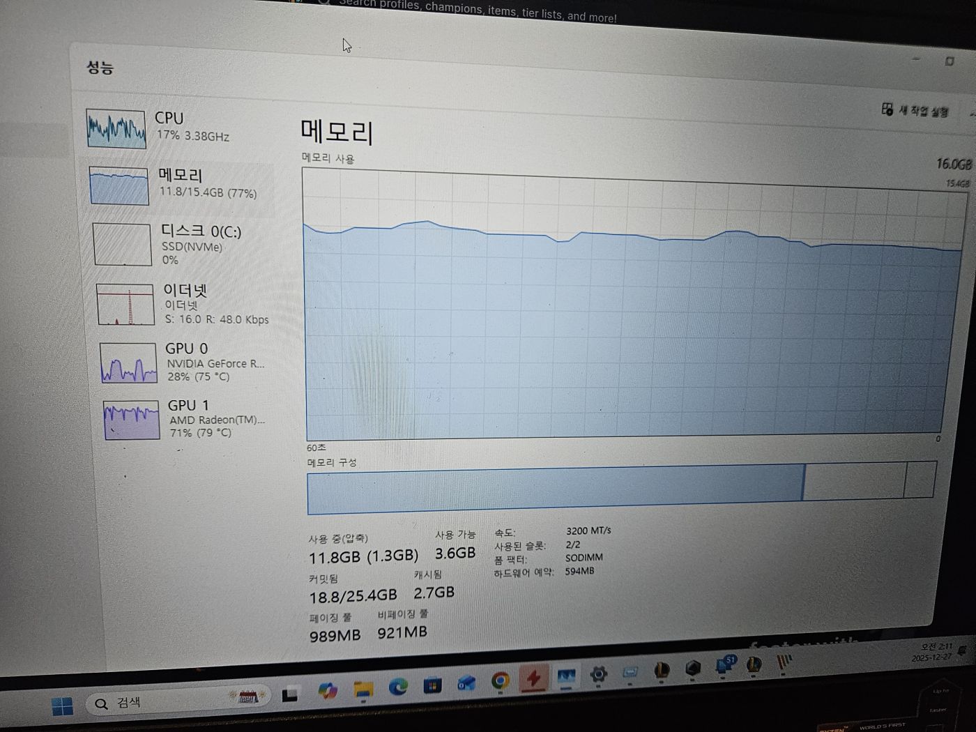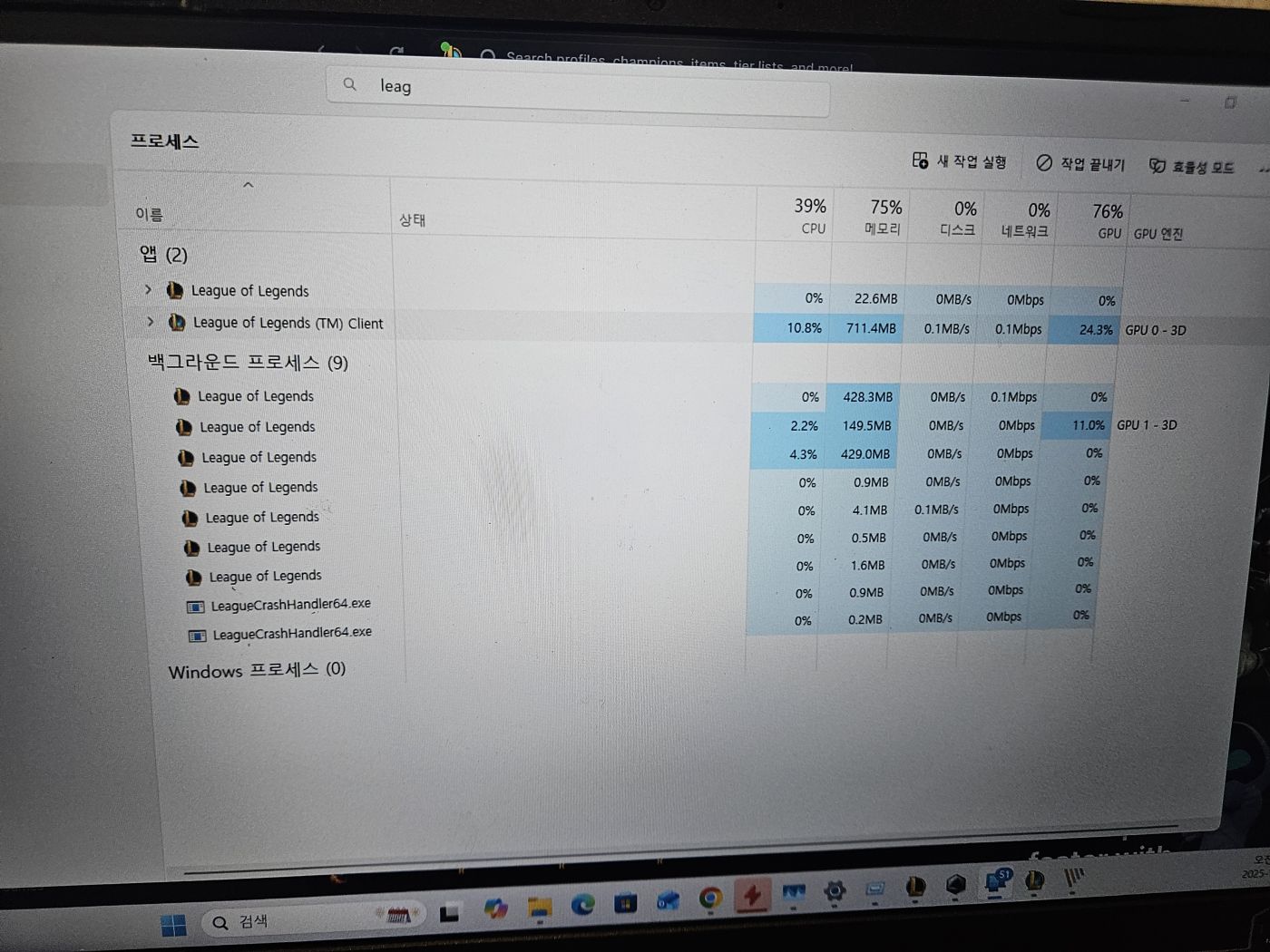 현재 장치관리자에서 프로세스를 보면 롤 클라이언트가 GPU 0(NVIDIA 2060) - 3D를 정상적으로 타고 있고