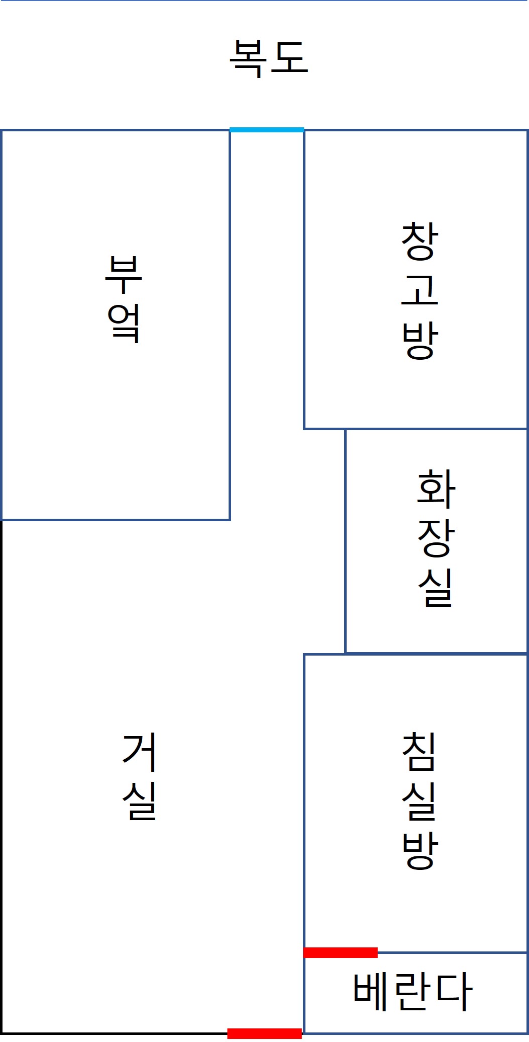 방구조는 위 그림과 같구요 복도 아파트에 방크기는 59m2 이며, 앞에 뭐 가리는거 하나 없는 완전 정남향입니다