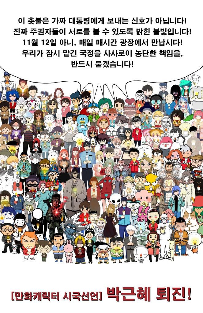 오다가 주웠는데 웹툰 작가들이 뜻을 모아 자신들의 만화 캐릭터로 촛불을 들고 시국선언을 한 그림입니다.