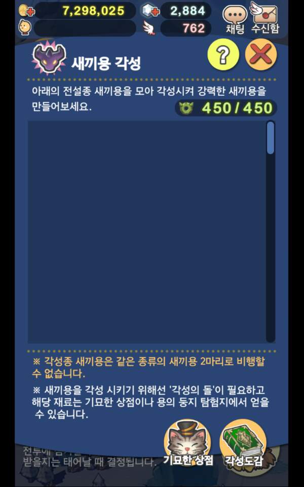안녕하세요 회원님들. 드래곤 플라이트 질문인데요~ 얼마전에 업데이트 내용으로 새끼용 각성이란 게 생겼더라고요. 그래서 신나게 각성을 하려고 하는데 각성의 돌을 다 모으고 골드도 충분한 상태에서 각성을 할 수 있는 화면이 안나오더라고요. 검색을 해봐도 다른사람들은 잘만 되는 것 같던데 전 왜 안될까요? 지금 가능한 각성용은 발터와 호아로 예호거를 만들고 싶습니다. 제가 어떤 부분을 놓치고 있는걸까요? 0