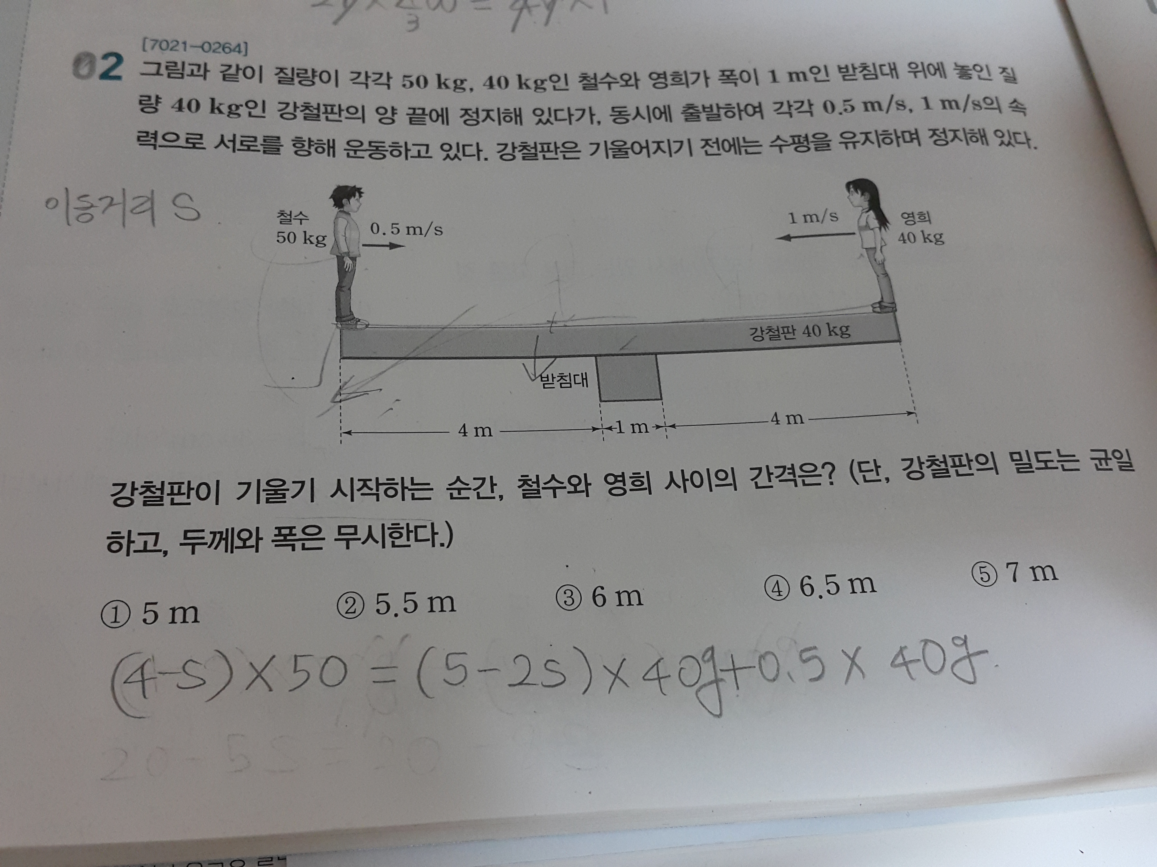 철수 쪽 강철판이 기울어지잖아요. 그래서 철수가 이동한 거리를 s라 두고 식을 써봤어요.