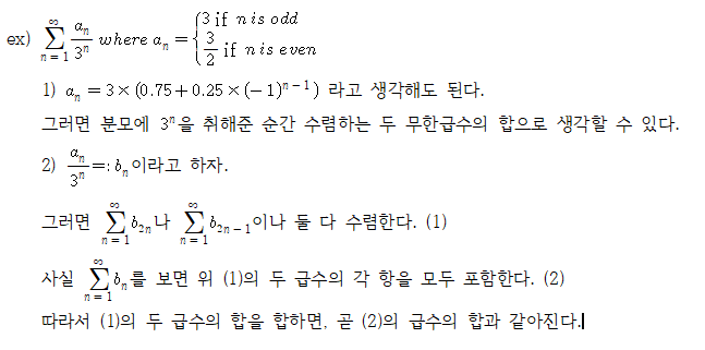 어떤 수열의 짝수번째 항만 모은 급수와 홀수번째 항만 모은 급수가 수렴하면 수열 전체의 급수도 수렴한다.. 이런 것들이요.
