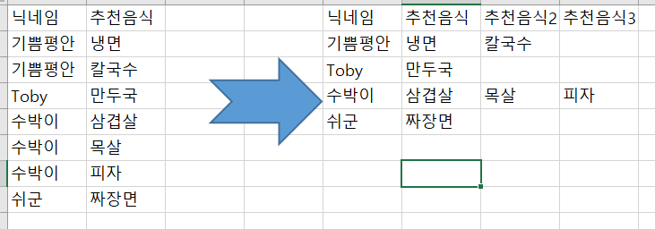 첨부 사진과 같이 왼쪽의 표가 정렬되어있는데요. 그것을 오른쪽으로 변환시키려고 합니다.. 데이터 양이 작으면 수작업으로 하겠지만, 데이터 양이 많아서..좋은 방법이 있을까요? 1