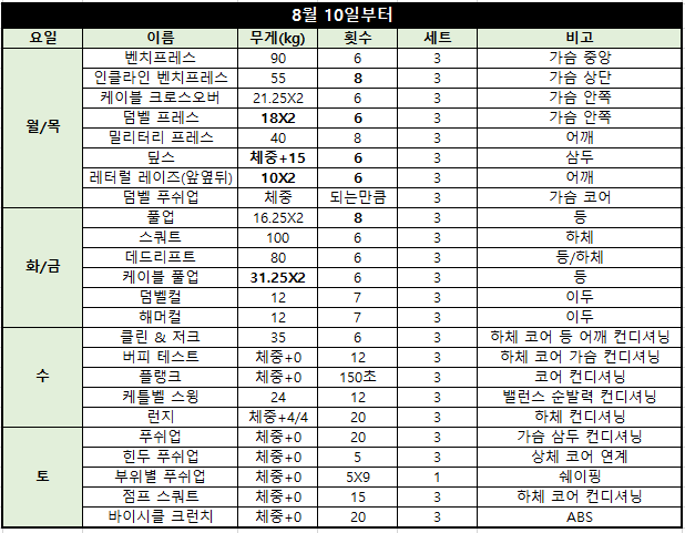 보시는 것처럼 월 목 / 화 금 2분할을 중심으로 수요일과 토요일은 컨디셔닝(이라 부르기도 민망하지만...)으로 구성해서 하고 있습니다.