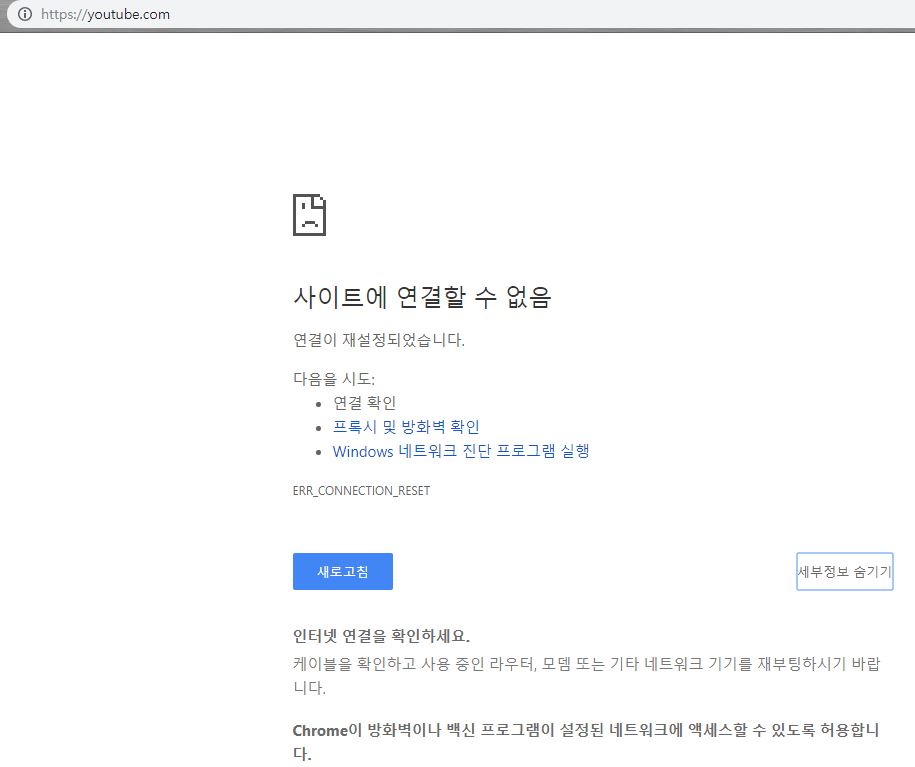 각종 페이지에 삽입된 유튜브 동영상도 페이지를 열수 없다는 에러 메세지가 나옵니다.