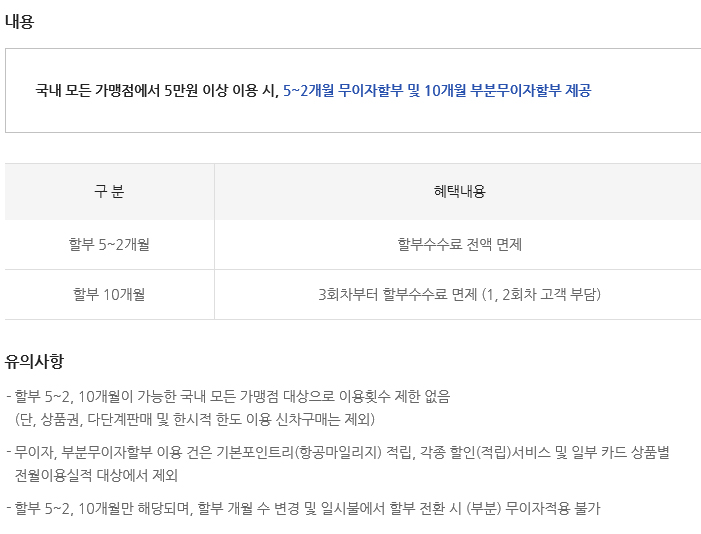 다들 안녕하신지요! 사용중인 신용카드사에서 첨부한 이미지의 이벤트를 하고 있습니다. 가끔 큰 금액이 들어갈 때 카드 할부를 이용하는데요, 저 이미지에 적힌 말대로라면 이 카드로 결제가 가능한 모든 업종에서는 5개월 무이자 할부가 가능하다는 뜻인가요? 모든 가맹점 대상이라고 하는데 그 가맹점의 정의를 잘 모르겠네요... 그냥 카드결제가 가능하면 가맹점이구나 이렇게 생각하는게 맞는지 궁금해서 여쭤봅니다~ 0