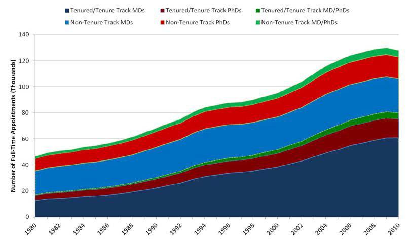 30년 사이 3배 안 되게 Full-Time Appointments가 증가했어요. 각각의 학위 조합이 매 측정년도 마다 얼마나 비중값을 지니는지를 보지는 못했지만, 시각화 자료에서는 Tenure Track MDs의 증가가 두드러지네요.