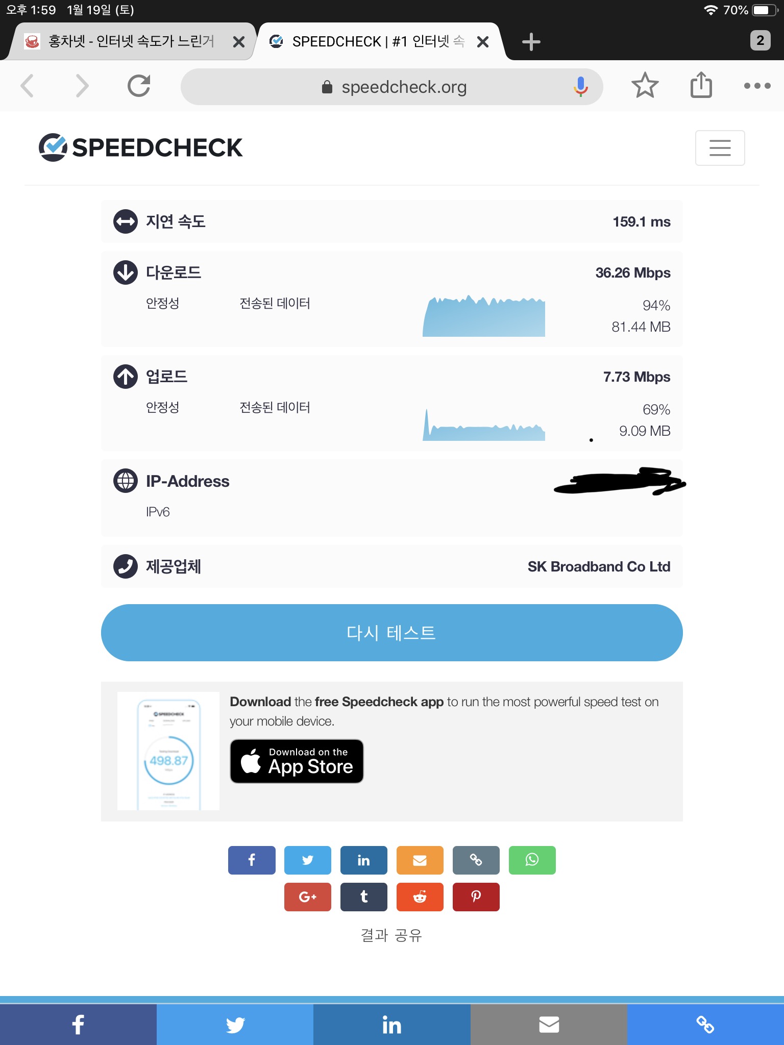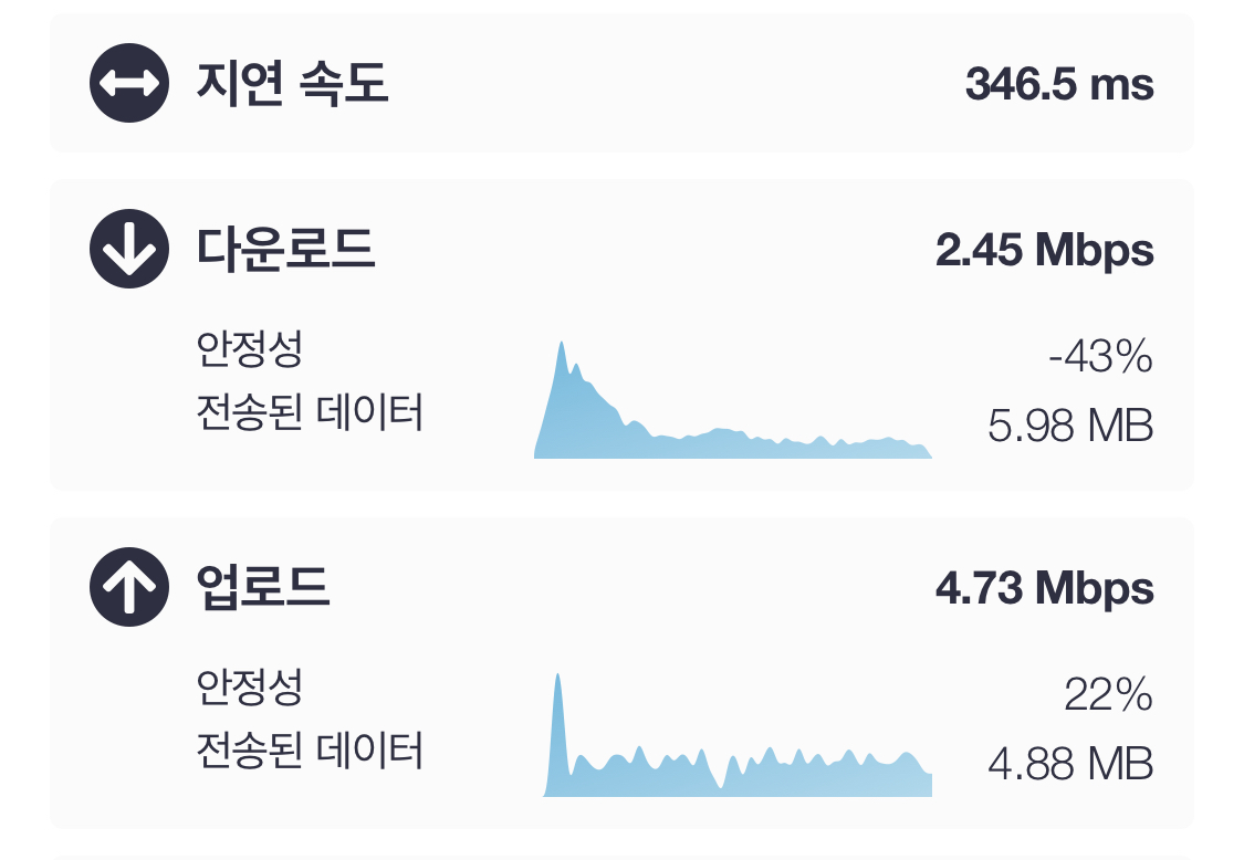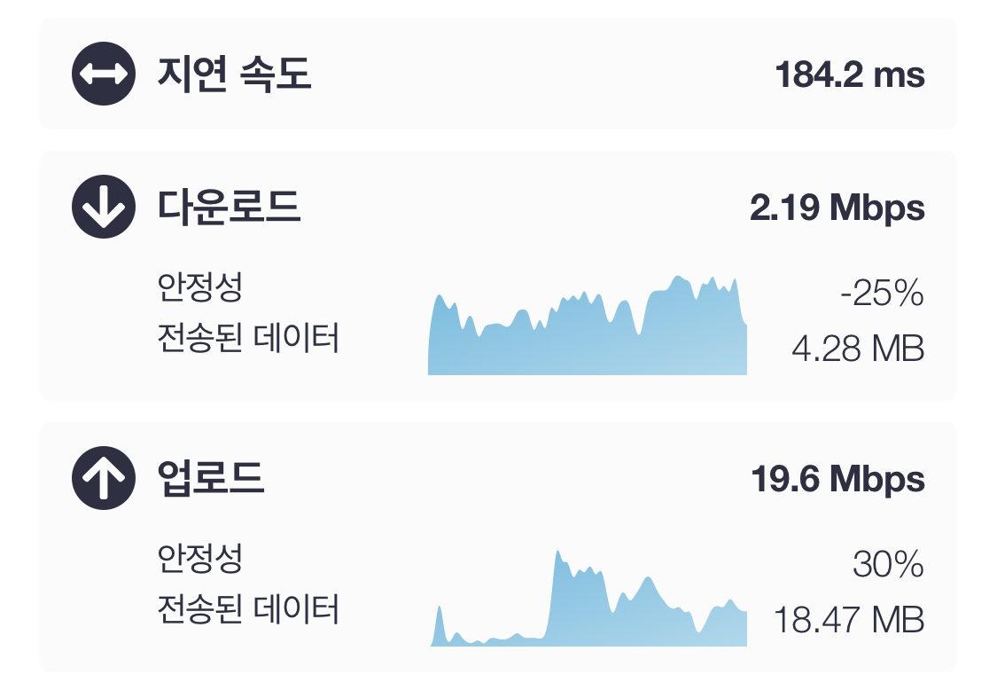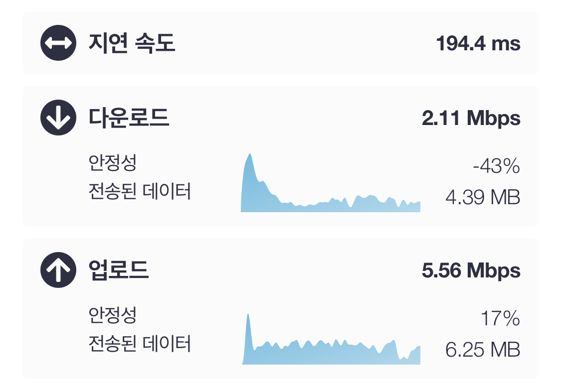 https://www.speedcheck.org/ko/ 요기서 체크해봤는데 결과는 첨부파일과 같습니다. 다운로드보다 업로드가 속도가 더 빠르네요? 무선 공유기랑 사용하는 아이맥이 거리가 좀 멀어서 느린거 같긴 한데... 다운로드 속도가 느려서인지 뭔가 큰거 다운로드 받고 있으면 속도가 급격히 떨어지는 느낌이 있습니다. 무선 공유기를 바꿀까 싶기도 한데 일단 기초적인 테스트 부터 해봐야 할 것 같아서... 여러분은 테스트 결과가 얼마로 나오나요? 0