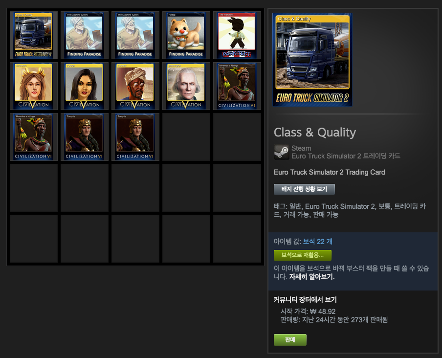 보관함에 들어가보니 트레이딩 카드라는게 이것저것 있는데요. 저는 이게 달성한 업적 목록 쯤으로 생각하고 있었는데, 보니까 팔기 메뉴가 있네요. 몇개 판매 상품으로 등록해봤는데, 생각보다 제가 가지고 있는게 많아서요. 게임도 많이 안했는데.... 팔아보신 분들 계신가요? 보통 이런거 생기면 파나요? 아니면 쓰면 좋은가요? 0