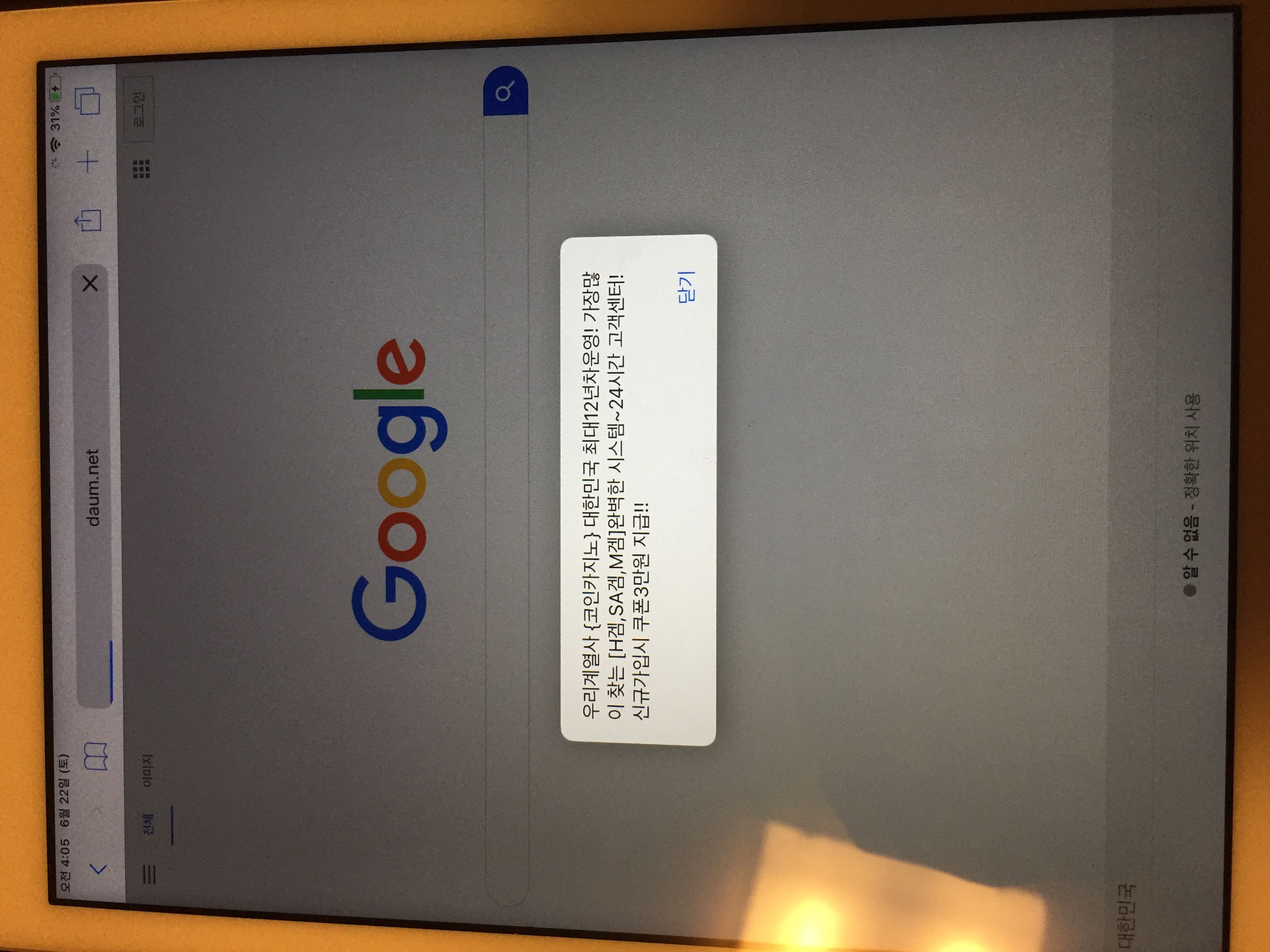 어머니가 쓰시던 아이패드인데 사파리에서 네이버 다음 등등 한국 웹사이트 들어가려 하면 저렇게 팝업 뜨면서 확인 누르면 카지노 사이트로 연결됩니다. 아이패드 설정에서 ‘모든 컨텐츠 및 설정 지우기’도 해봤는데도 또 뜨네요. 공장초기화한 거 아닌가요? 그런데도 뜨는 게 가능한 건가요;; 이상한 바이러스 같은데 아시는 분 계시면 도움 좀 부탁드립니다ㅜㅜ 0