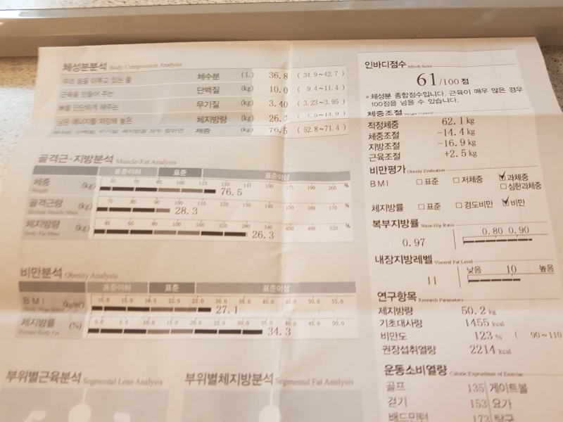 근육량은 평균 수준인데 체지방 비율이 너무 높아요... 특히나 복부비만도 심합니다.