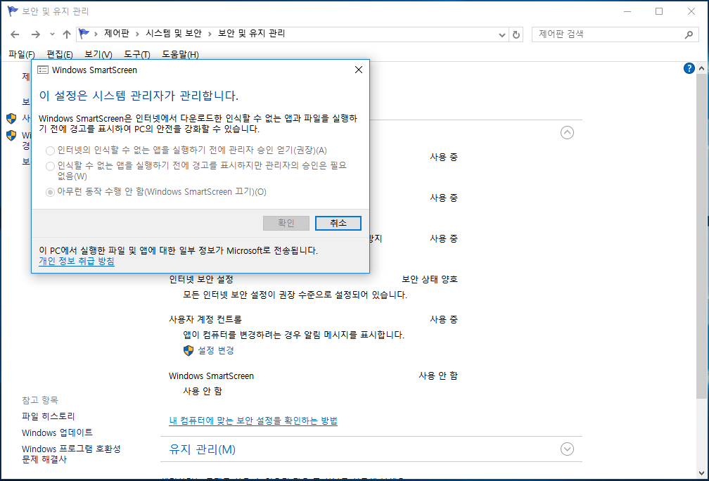 안녕하십니까. 이번에 윈도우7에서 윈도우10으로 업그레이드를 했습니다. 하나씩 설정을 하던 도중에 막힌 부분이 있어 이렇게 글을 남깁니다. <제어판 - 시스템 및 보안 - 보안 및 유지 관리> 이렇게 들어갔는데, 사진처럼 smartscreen 항목은 아예 선택 자체가 불가능하더군요. 혹시 이런 문제를 겪으신 분이나, 해결하신 분 계신가요? 관련 내용을 알고 계시다면 답변 부탁드립니다. 0