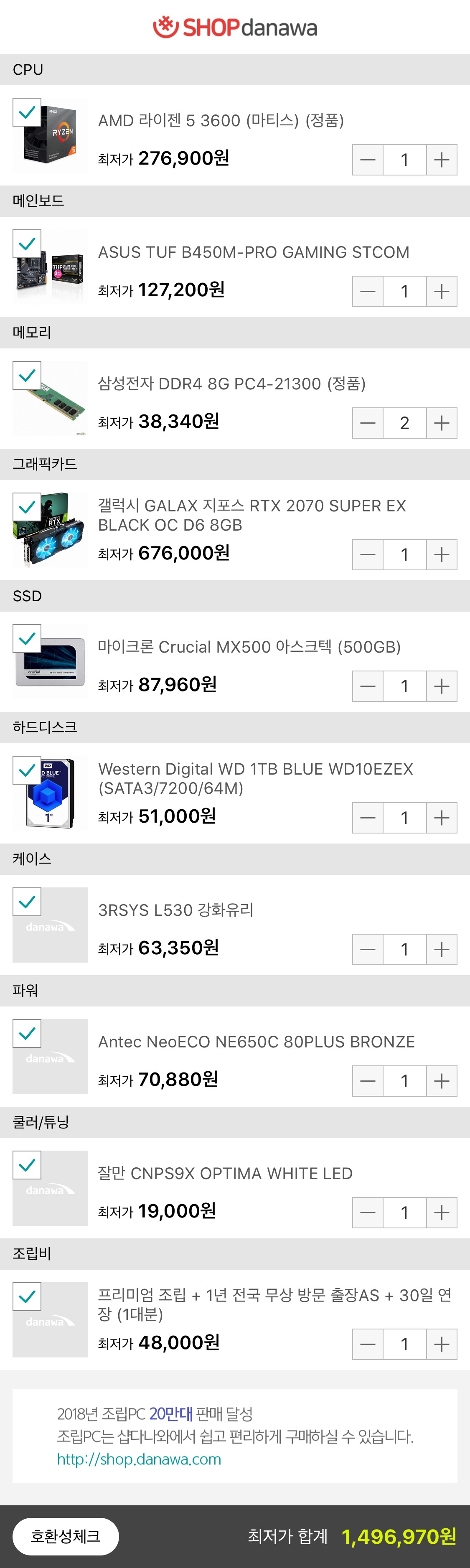 이젠 하스웰을 슬슬 보내줘야 할 때가 아닌가 싶기도 하고. 모바일 게임을 멀티 에뮬레이터로 돌리는 데에도 벅찬 상태입니다. 그 동안 계속 인텔만 써 와서 AMD에 대해서는 지식이 거의 없습니다만. AMD를 추천해주는 사람들이 하도 많아서 그에 따라 견적을 맘대로(?) 짜 봤습니다. CPU: AMD 라이젠 5 마티스 3600 (헥사코어/3.6GHz/) 메인보드: ASUS TUF B450M-PRO GAMING STCOM (AMD B450/M-ATX) RAM: 삼성 DDR4 16GB PC4-21300 (*2) SSD: 삼성 860 series EVO 500GB HDD: WD BLUE HDD 2TB WD20EZAZ 그래픽 카드: SAPPHIRE Radeon™ RX 590 NITRO Special Edition OC D5 8GB Dual-X 파워: 잘만 ZM700-LX 80PLUS STANDARD (ATX/700W) 케이스: 잘만 S3 풀 아크릴 미들타워 케이스 많은 조언 부탁드립니다. - The xian - 0