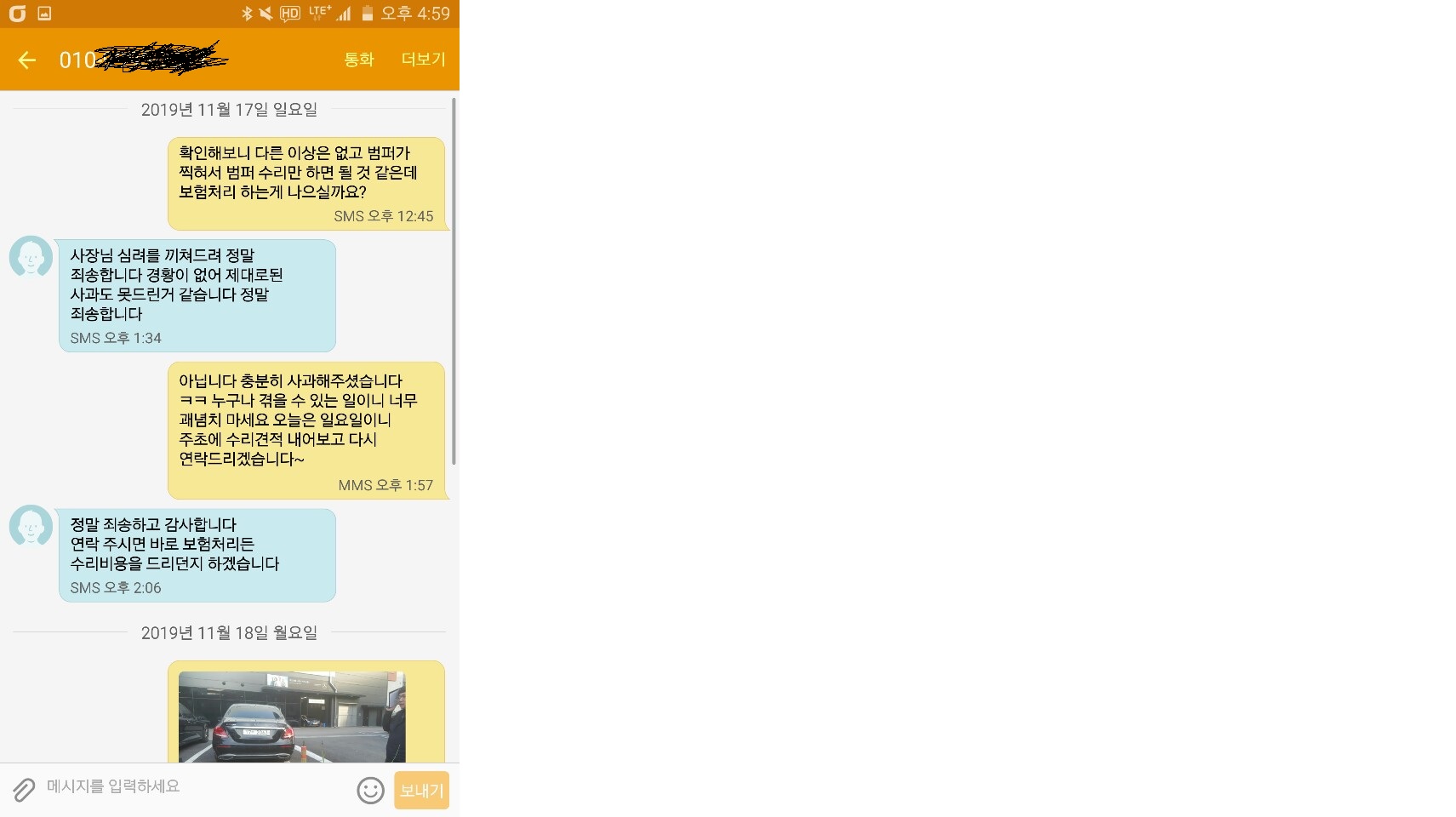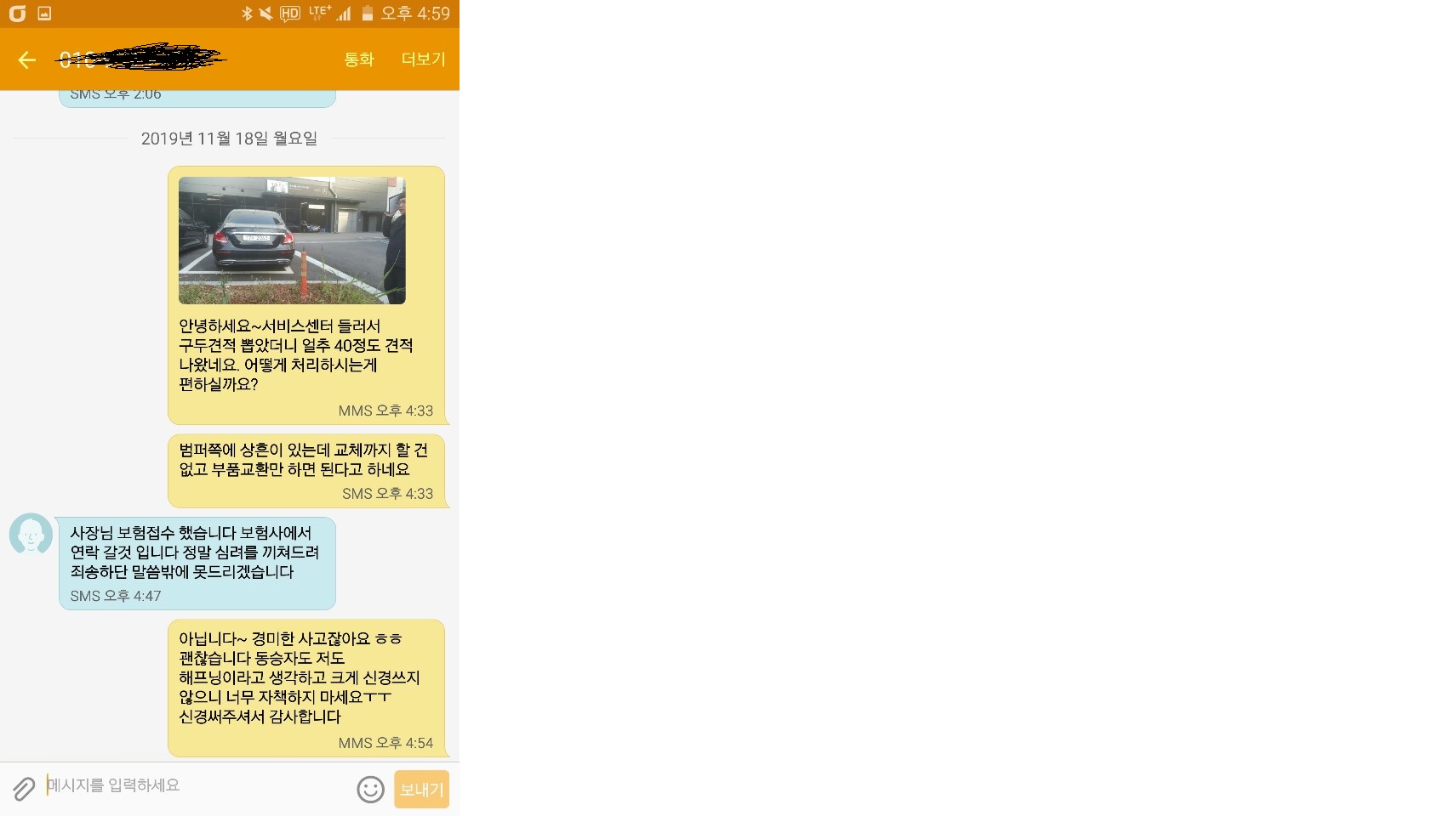 지난 주말 대부도에서 즐겁게 놀고 귀가하던 길이었습니다. 비도 많이 오는지라 대부도를 빠져나오는 길이 꽤 막혔는데, 정차 중 뒤에서 콩 하더라고요. 뭐 쿵 콰직 이런 거 아니고 아이콩! 막 이런 느낌으로요. 일단 내리긴 내렸는데 운전자분이 너무 죄송해하시더라구요 ㅜㅜ 비도 오고 차도 막히고 육안으로 보았을 때 딱히 차량상흔이 보이지 않아서 우선 명함 받고 헤어졌는데 집에 와서 보니까 뒷범퍼가 찍혀있더라구요. 서비스센터에 들러 수리견적을 내보니 공임 포함 40정도가 나왔습니다. 가해차량 차주분께 연락드리니 보험처리 해주시겠다고 하는데, 여기서 전 뭘 더 하면 되나요? 제 보험사에 연락을 해야 하나요? 아니면 그냥 밥숟가락을 떠먹여주길 기다리면 될까요? 아 참고로 차주분이 되게 죄송해하셔서; 우선은 별 탈 없이 원만하게 처리되지 않을까 합니다 ㅜㅜ 혹시 몰라 문자내역을 첨부합니다. 이 정도면 문제 없으려나요? 접촉사고가 처음이라 잘 몰라서 질문드립니다! 0