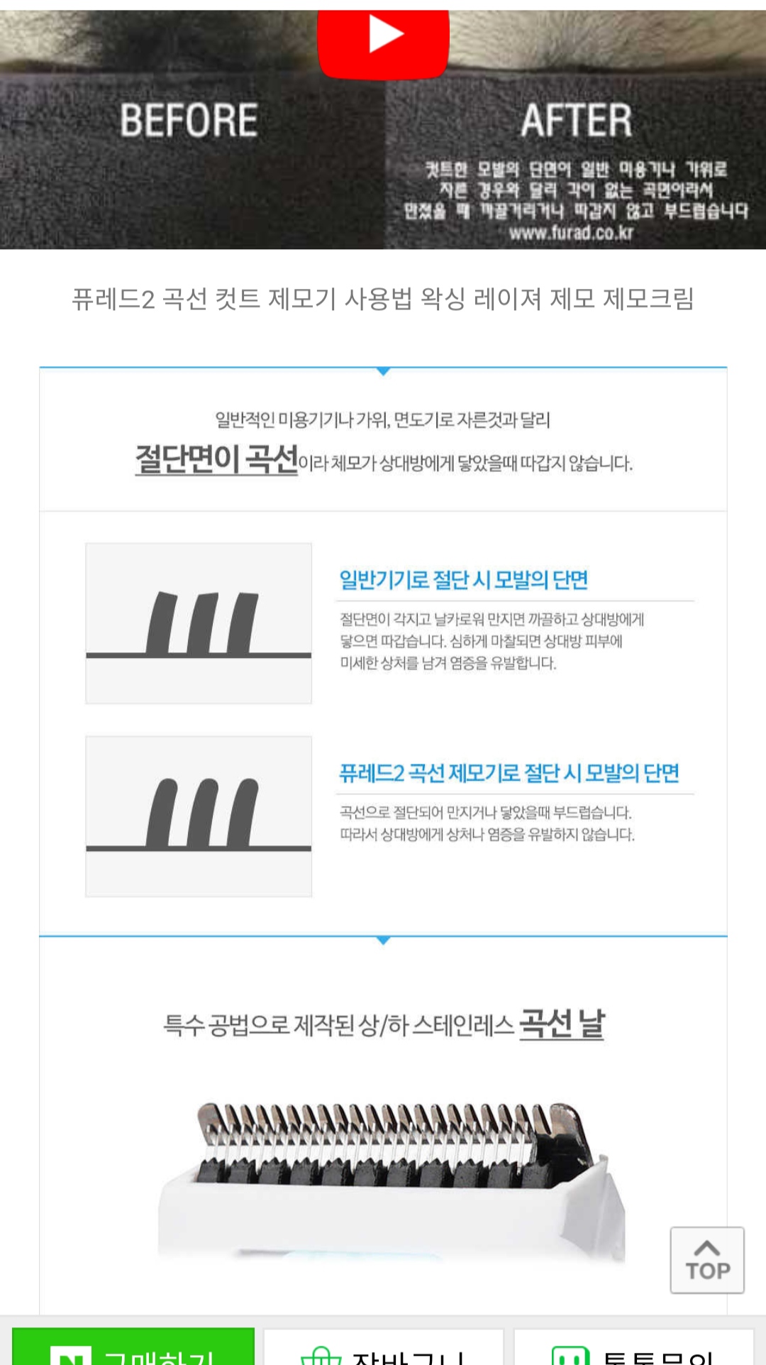 도저히 이해가 가지 않아서 이과(?) 분들께 여쭈어 보고 싶습니다. 스크린샷처럼 자르는게 가능한가요? 이런 제품이 있다면 전세계적으로 이미 많이 나오지 않았을까요? +정확히 말하면 면도기라기보단 트리머, 바리깡이 되겠네요. ++정말 이렇게 부드럽게 잘라준다면 사보고 싶습니다만, 신뢰가 가지 않고 가격도 비싸길래 고민중입니다. 0